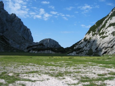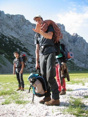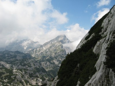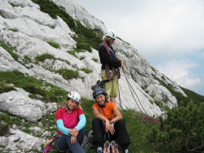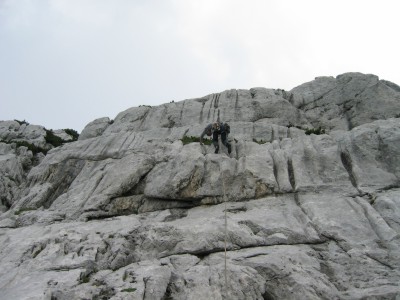Ob 18h v soboto smo bili zmenjeni na Korošici, da tečajniki preživimo prvo bivakiranje (no, vsaj nekateri od nas) in v nedeljo še kakšno splezamo. Ker je bilo škoda neizkoristiti sobotni dan se nas je nekaj odpravilo gor že v soboto zjutraj. Sašo, Metka, Kaja, Rok, Matej in jaz smo se torej odpravili na pot zjutraj in okoli 12h smo bili že pod Velikim vrhom pri Korošici s prekrasnim razgledom na Ojstrico… no, občasno, ko so se oblaki za kak trenutek razkropili, je bil razgled in pogled na bližnje vrhove naravnost fantastičen.