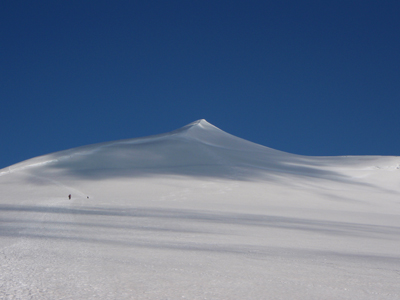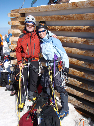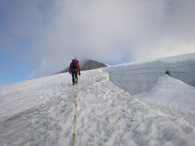 V nedeljo sva vstala ob petih zjutraj. Ob že poznanem »rumlu« na skupnih ležiščih, žvenketu opreme ter sortiranju oblačil sva pozajtrkovala ter preko ledeniške morene pričela vzpon k ledeniku. Tu naju je sicer ujelo par kapljic dežja, a sva se medtem, ko sva se navezala ugotovila, da na ledenik že sije sonce. Nadaljevala sva s prečenjem ledenika ter po prestopu kakšnih ducat razpok in obvozu katere, ter tako prišla na plato, s katerega je v soncu vabil vršni greben. Greben razen zadnjih nekaj metrov ni izpostavljen, a je ob množici drugih gornikov potrebno paziti na korak. Na vrh, ki meri nekje med 3656 in 3674 metri (odvisno od vira), sva prispela v čistem soncu nekaj pred deveto uro. Naredila sva par posnetkov ter uživala v razgledih na Visoke ture, Dolomite…