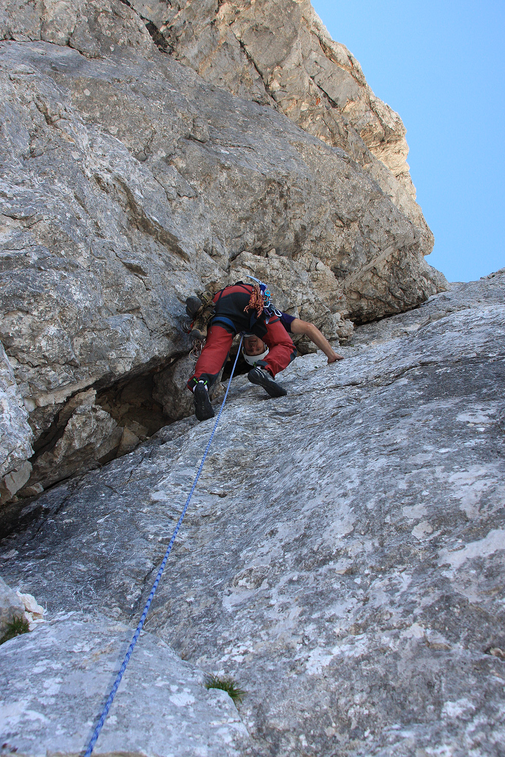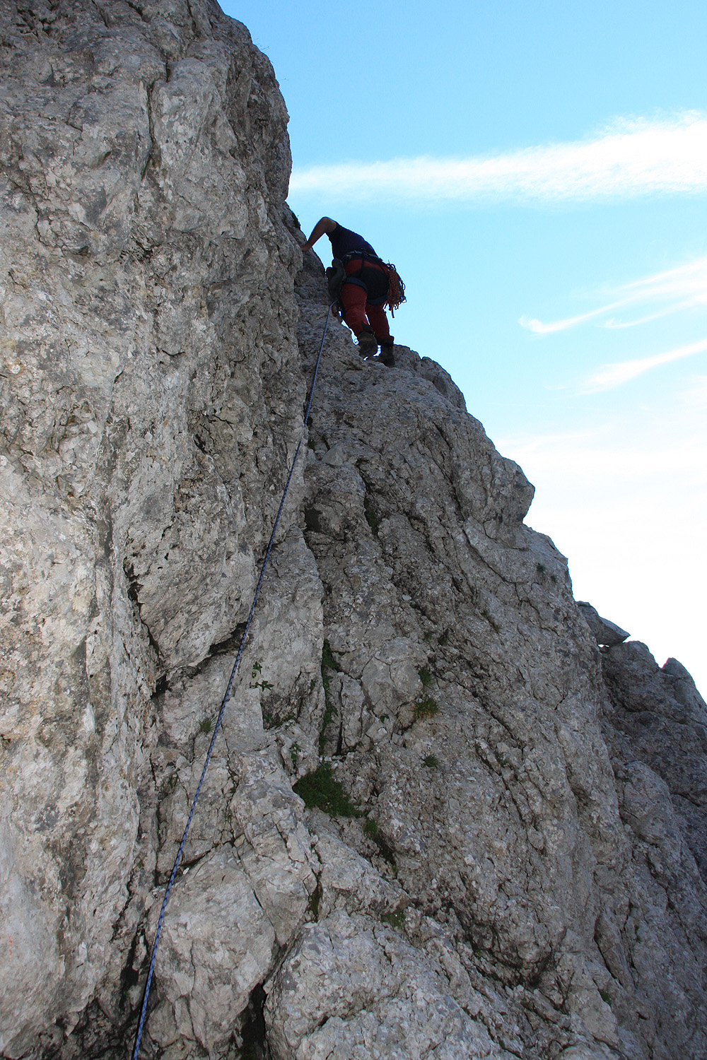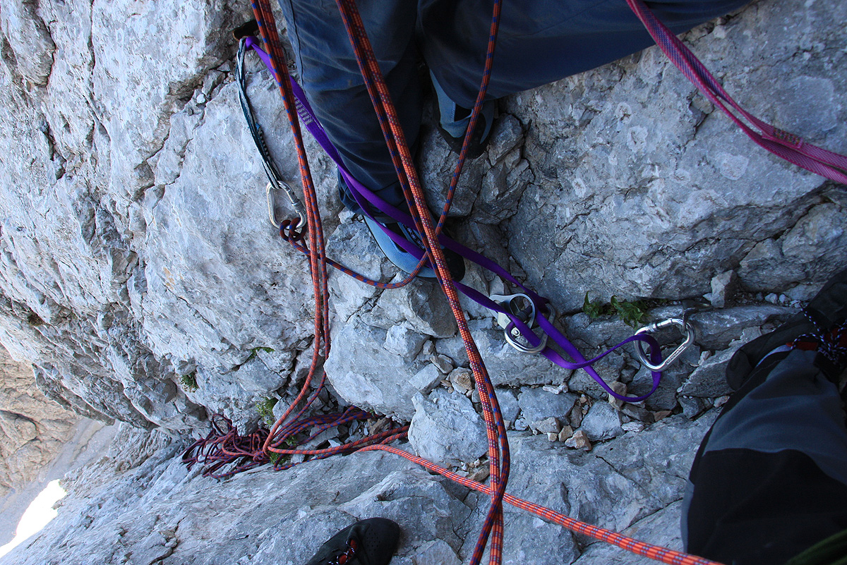 V steno smo vstopili malce nad začetkom zavarovane poti. Kot prva naveza sta startala Pavel in Majda, nekaj kasneje pa tudi midva z Marjanom. Prvih nekaj metrov vzpona okoli skale ni bilo nič posebnega, nato pa sem se znašel v dilemi: ali po polički malce navzdol okoli stene, ali pa v kamin levo nad mano. Kar nekaj minut kličem na vso moč Majdo v prvi navezi, vendar zaman. Očitno je bila takrat že daleč naprej. Pokličem Marjana pod mano, tudi on še ni bil v tej smeri, tako je odločitev padla name. Pričakoval sem, da bo šlo bolj ali manj navzgor, zato se odločim za pokončen kamin. Prvi meter, dva je bilo plezanje kar udobno, potem pa teren vse bolj krušljiv in pokončen. V zgornji polovici kamina sem imel občutek, da je tole kaj več kot navadna štirica. Zlezem še zadnji najtežji del in pridem pod nekoliko previsno ploščo, ki bi jo brez tovora verjetno tudi naskočil. Klina, ki bi ga nama naj pustila prva naveza pa nikjer! Takoj pomislim na Pavlija. Na tako zahteven (krušljiv) teren brez varovanja on že nebi peljal nikogar. Iz vrha kamina ga končno uspem doklicat, takrat je bil že daleč naprej na drugi strani. Z Marjanom pa zaradi razdalje nisva imela komunikacije. Sedaj mi je kapnilo, da sem spodaj izbral napačno. Pavli se takoj ponudi, da pride cel raztežaj nazaj pome, Marjan nekje daleč pod mano sprašuje kaj se dogaja, vendar imam občutek, da me ne sliši. Sam pa razmišljam kako bom s težkim nahrbtnikom varno splezal krušljiv in strm kamin navzdol.