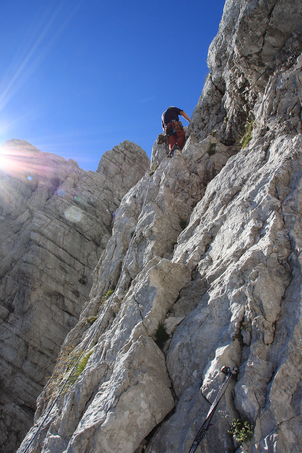 Težje – gladke segmente zaradi varnosti zlezemo skupaj. Za zadnja dva raztežaja se odločimo za sicer težjo in nekoliko daljšo levo varijanto, vendar lepšo od normalne. Ni nam žal, postreže nam s prečenjem pokončne stene nad Turskim žlebom, dvema skokoma in grebenskim plezanjem do vrha.