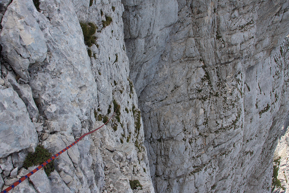 Gornji del smeri – dva raztežaja do izstopa. Pogled nazaj dol, po prečenju stene.