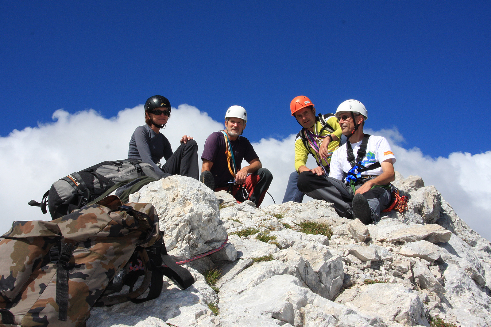 Ko prilezemo na vrh Male Rinke je Kamniško sedlo globoko pod nami, vsi smo veseli, saj je za nami zares lep plezalni vzpon v odličnih vremenskih razmerah. Vsi štirje smo se tudi dobro ujeli. Tako, da je bilo pravi užitek biti v steni tudi v tem pogledu.