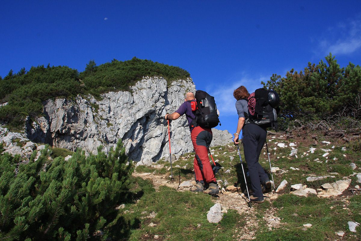 Tretji raztežaj ni nič posebnega, pohodno za plezalce. Razen v zgornji polovici kjer se je potrebno malce bolj poprijeti za skale. Zadnji, četrti raztežaj ima na začetku en krajši detajl, v starejših vodnikih označen kot najtežji, z oceno IV+. Nam, no, vsaj meni se ni zdel nič posebno zahtevnega, z zahtevnostjo v drugem raztežaju sploh ni primerljiv. In ko ga premagamo, si na vrhu med borovci, po dveh urah plezanja sežemo v roke za uspešno izpeljan vzpon. Smer Kamin pri Durcah ali Originalna je kratka, vendar jedernata. Navrtana je, ampak svedrovci so postavljeni zelo, zelo na redko. Športni plezalci bi znali tu zaiti v resne težave. Sam “skočim” sedaj dol na Durce in naravnost po zdrsljivem žlebu v grapi, skoraj dvesto višinskih metrov v smeri koče na Grohotu. Končno le najdem izgubljeno prvo pomoč in se začnem vzpenjati nazaj na preval. Ta dan smo nameravali opraviti še z eno plezalno smerjo, ker pa se je vreme nekaj kujalo, smo se raje odločili za pohod na vrh Velike Raduhe. Tam si privoščimo počitek in zasluženo malico. Sledil je le še povratek nazaj, s postankom (in rogovi) na koči, nato pa veselo proti domu.