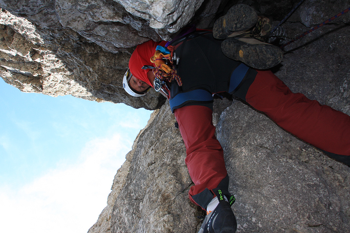 Majda med tem zleze zahteven drugi raztežaj do konca in na vrsto pridem še sam. Previs ti da misliti, sicer pa se ga z nekaj taktike in moči da zlezti. Plošče levo nad njim sem se izognil in se raje držal Pavlove smeri – mokre zajede desno ob plošči. Ko zlezem iz delikatnega detajla se znajdem v kaminu. Poizkusim najprej z nogami levo/desno, ob tem pa se v navpični steni kamina opiram na roki kot nihalo. V treh poizkusih neuspešno – desna stena kamina je namočena, opore za trenje ni. Ampak gor bo nekako potrebno zlezti. Ne bo druge kot z gnezdenjem, s hrbtom v mokro steno in obema nogama v sosednjo suho. V sredini kamina se mi med napredovanjem odpre ježek prve pomoči. Malo prej je še visela za pasom, sedaj pa prosto pada v prepad pod mano, kot bi jo izstrelil. Torbica že v zraku dobi rotacijo kakor da je glinasti golob in lahko sem le nemočno opazoval prvi nalet v grapo pod vstopom. Pok sta slišala tudi Pavel in Majda visoko nad mano. Ponovno jo je odbilo v zrak in kmalu je izginila za steno, v smeri poti proti Grohotu. Kar je, je. Napredujem po malem in se do izstopa iz kamina bolj ukvarjam s tem, da mi med stenama z minimalnimi oprimki nebi zdrsnilo, kot pa s čim drugim. Po kaminu sledi še nekaj metrov lahkega, skoraj pohodnega terena. Aleluja, tale raztežaj pa ni bil hec. Sedaj vem zakaj je Majda v njemu tako “vriskala”.