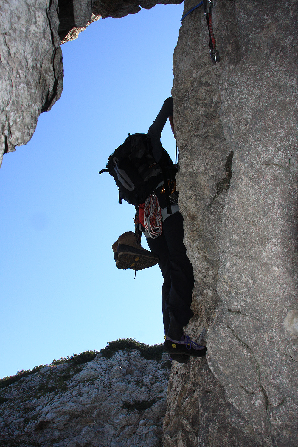 Pogled navpično navzgor, Pavel visi pod previsom.