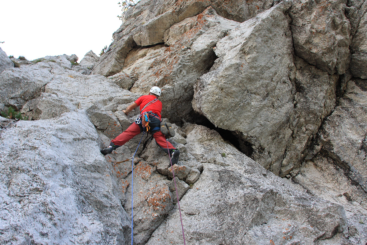Raztežaji so štirje. Prvi je izjemno kratek, kakšnih trideset metrov vrvi smo porabili v njemu. Najprej prečimo okoli stene v zajedo in nato navzgor po levem delu skale. Oprimki v dnu niso kdo ve kako trdni, sicer pa je tudi zahtevnost nižja, primerna za ogrevanje. Pavli v mokri “luknji” pod previsom uredi sidrišče za drugi raztežaj. Zlezti zadnjih par metrov do tja je bila uvodna zabava – mala predjed. Nič posebnega v primerjavi s tem kar nas čaka v drugem raztežaju. Premagati bo potrebno tečen previs in gladek kamin nad njim. Pripravim varovanje za Pavla in že se zapodi pod strop “luknje”. Zahtevnejši del je še posebno zabaven saj sta strop previsa in desna stena kamina na ključnih mestih namočena. Občudujem Pavlija kako se z napori, vendar premišljeno izvije izpod previsa, potem pa izgine v kamin iznad luknje v kateri sem ga varoval. Napredujemo počasi saj ta del smeri ni od muh. Kar odleglo mi je, ko je sporočil da je na sidrišču.