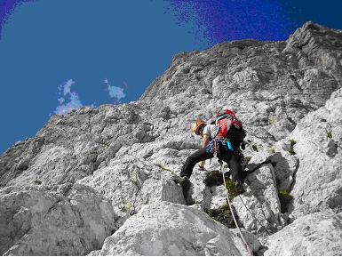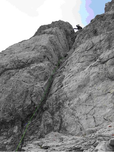 S skupnim posvetovanjem smo vstopili v smer in prvi raztežaj splezali nenavezani, saj je bil ocenjen s slabo trojko. Ko smo prišli do plošč, smo zabili prve kline in dve navezi; Alen in Erik, ki je opravljal izpitno turo za alpinista, ter Maček in Tanja in začeli s plezanjem. Tudi ta raztežaj je bil dokaj lahek in nas je popeljal do značilnega kamina, nato pa skozi žleb na teraso Kegljišča. Prečili smo jo levo navzgor, tukaj je orientacijsko zelo zahtevno. Nato po policah in nekaj ploščah navzgor do lope. Tukaj plezamo trojke in štirke.