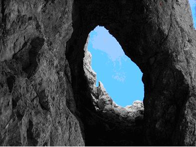 Prišli smo do znamenitega Jalovčevega okna, vstopili skozenj in nadaljevali pot proti vrhu čez Jalovčevo Streho. Tu je smeri konec, do vrha pa je še približno 1 uro hoda.