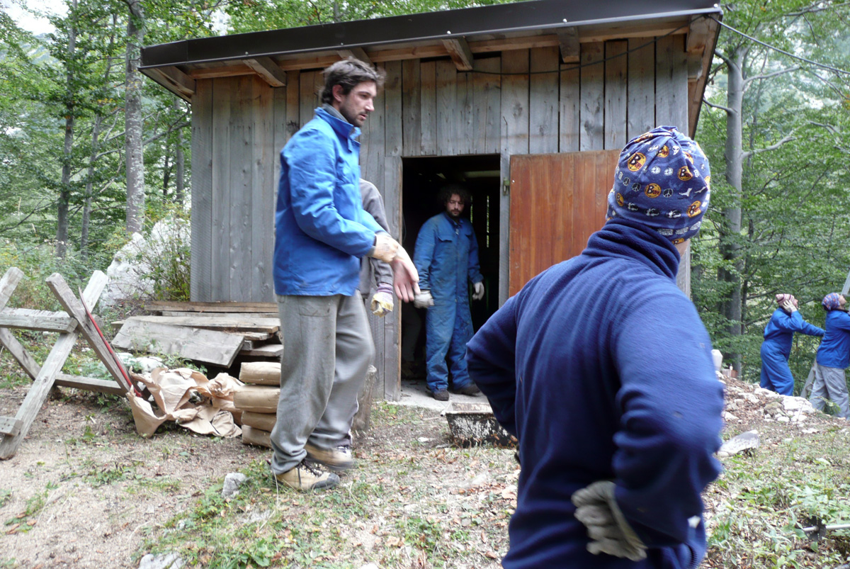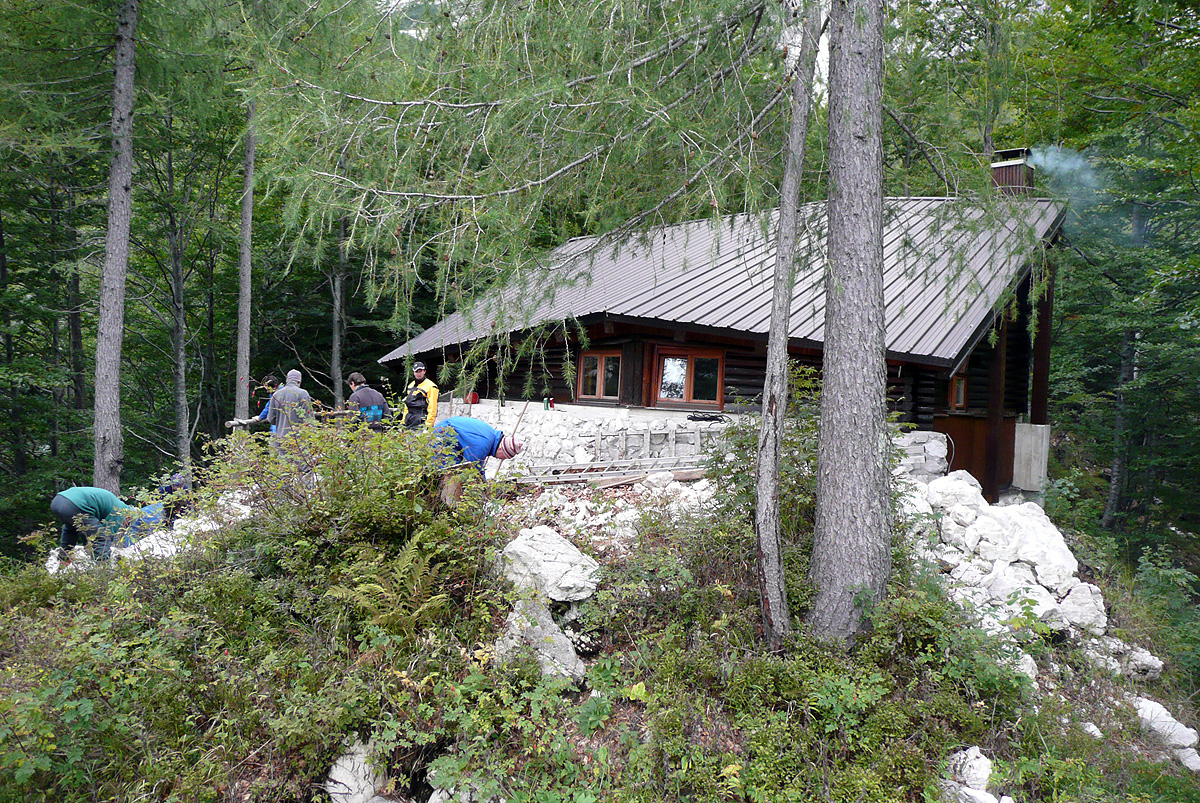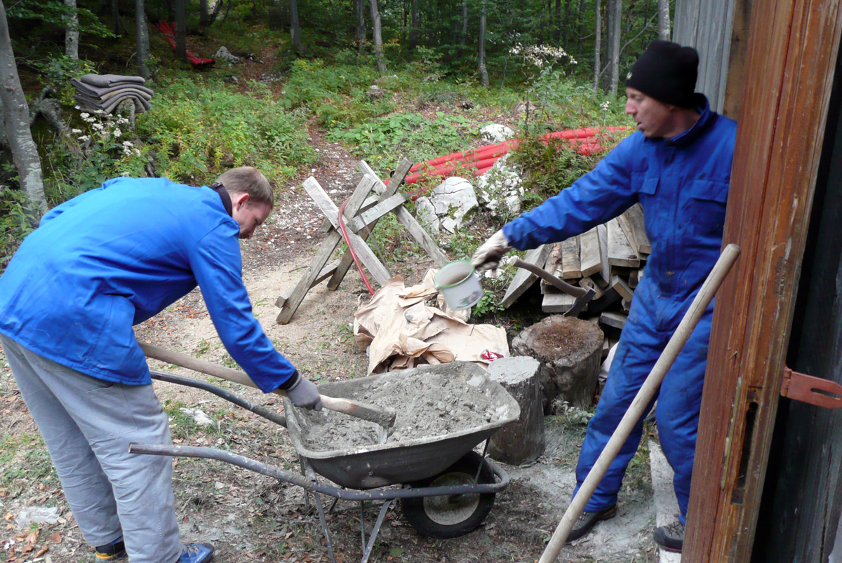 Večji del delovne ekipe je prispel gor že dan prej, ostali pa v soboto zjutraj. Po jutranji kavici smo vsi zavihali rokave. Eni so kopali jamo za škarpo, drugi pripravljali beton, tretji pa teren za barvanje. Do popoldneva smo opravili kar nekaj težaškega dela in menda celo izpolnili plan. Med tem sta Tanja in Klavdija pripravili okusen golaž, ki smo ga še vročega “pospravili na varno”. Vseh petnajst? nas je bilo na koncu zadovoljnih z opravljnim delom.