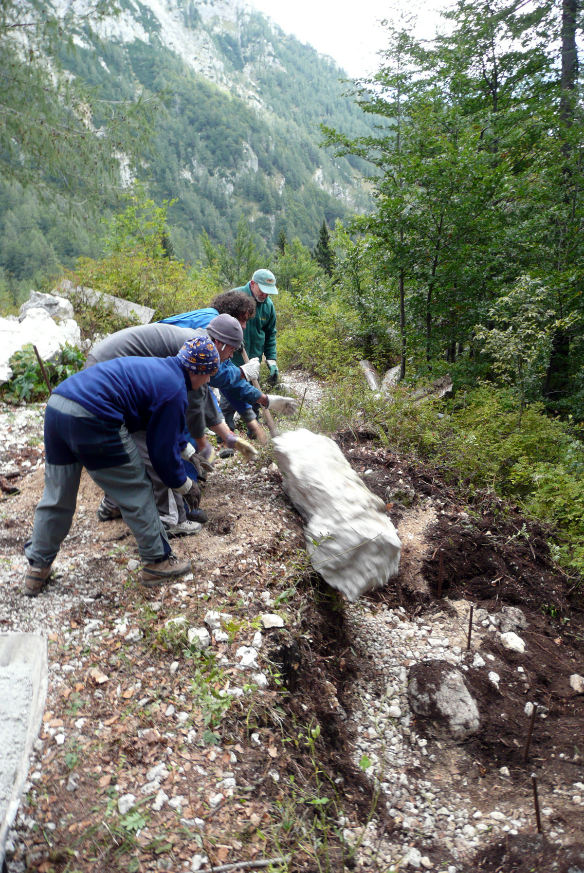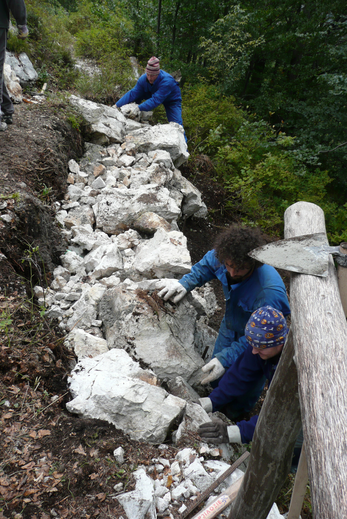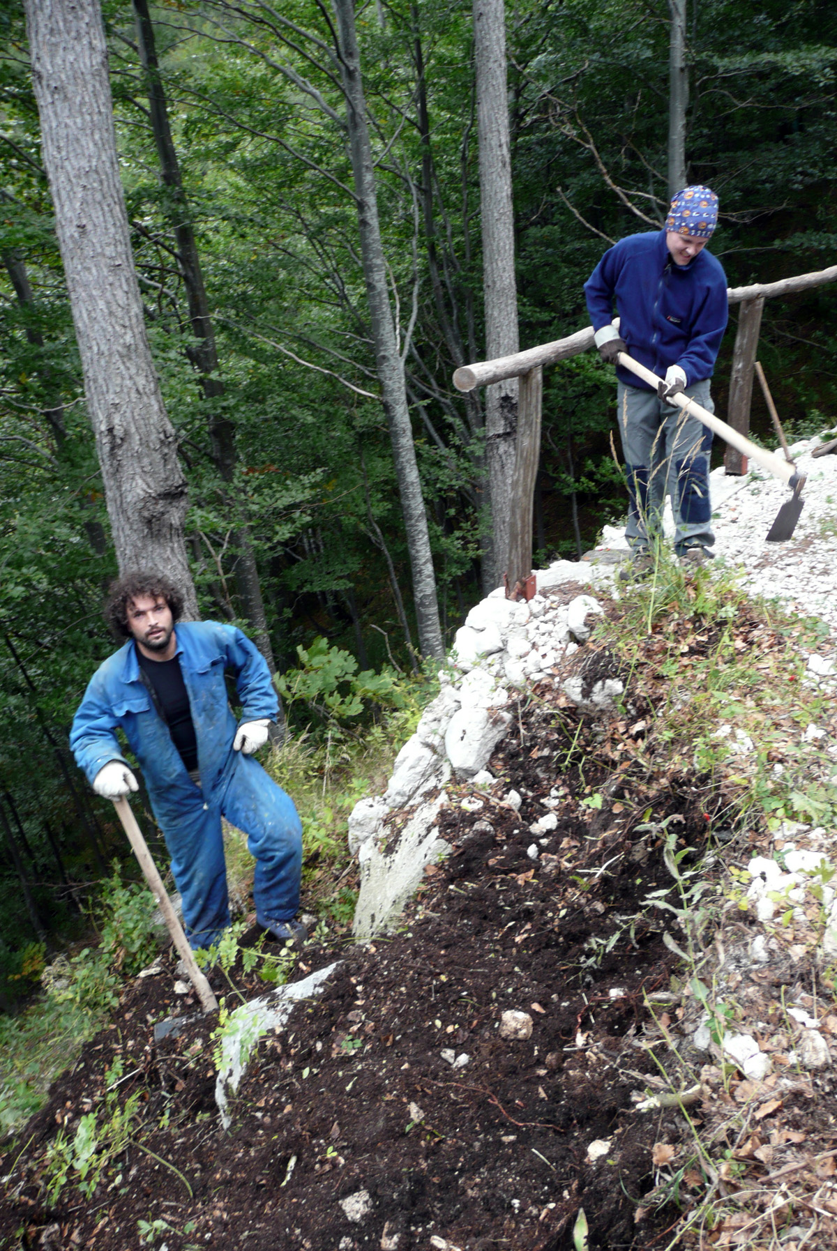 Večji del delovne ekipe je prispel gor že dan prej, ostali pa v soboto zjutraj. Po jutranji kavici smo vsi zavihali rokave. Eni so kopali jamo za škarpo, drugi pripravljali beton, tretji pa teren za barvanje. Do popoldneva smo opravili kar nekaj težaškega dela in menda celo izpolnili plan. Med tem sta Tanja in Klavdija pripravili okusen golaž, ki smo ga še vročega “pospravili na varno”. Vseh petnajst? nas je bilo na koncu zadovoljnih z opravljnim delom.