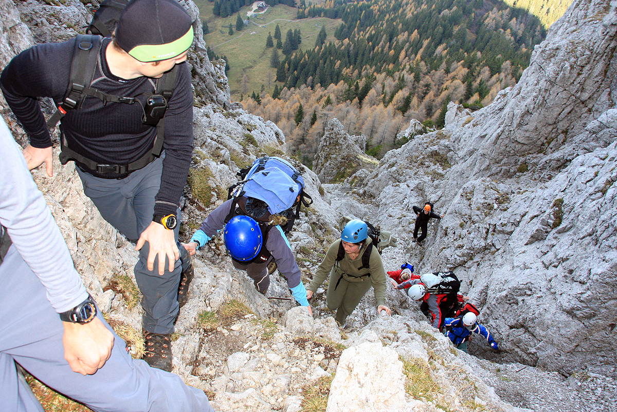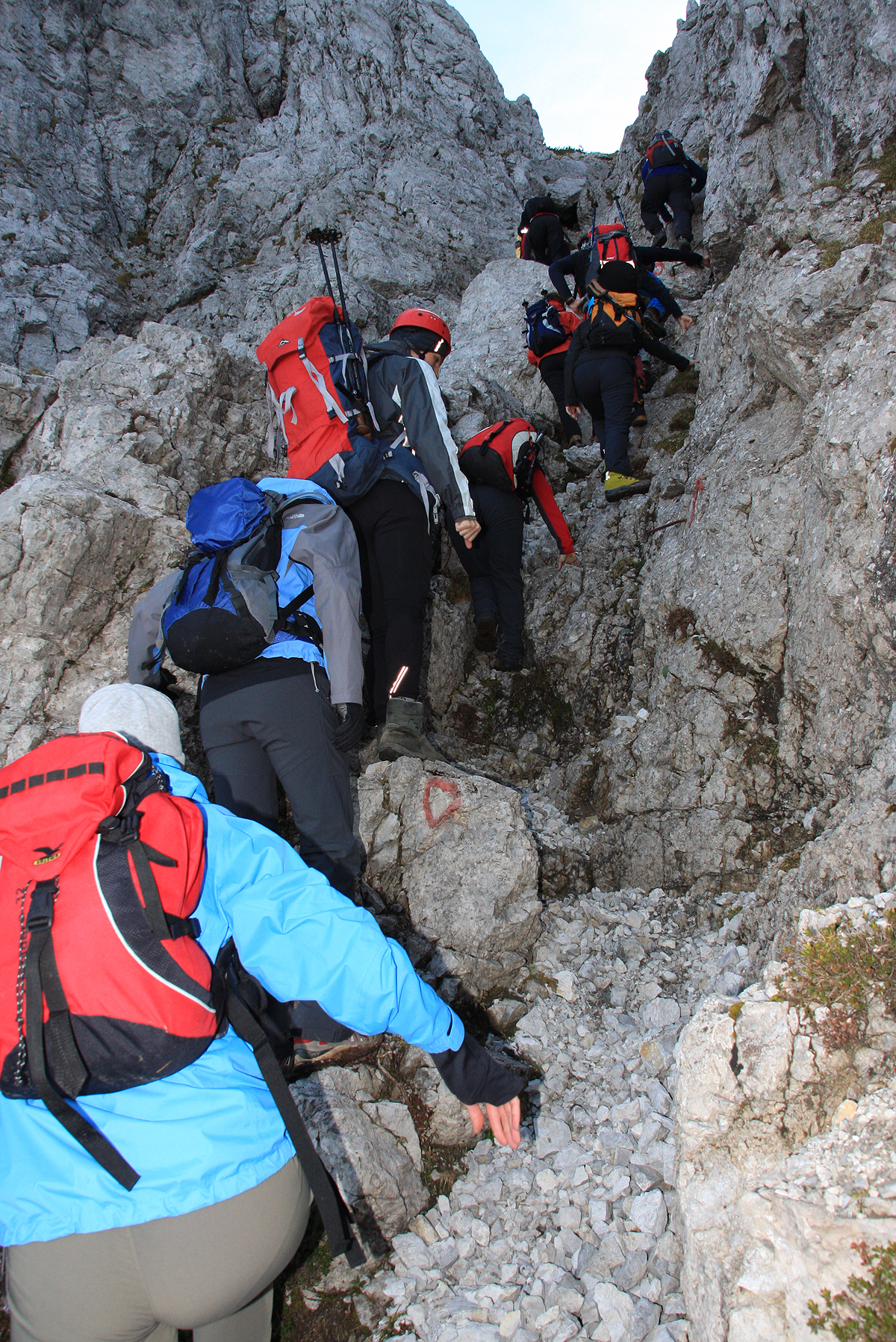 Na grebenu je dokaj pihalo, ko smo zapustili gozdno mejo, pa smo se kmalu znašli v jeklenicah. Poplezavanje v ne preveč strmi steni je bilo nekaterim kar zabavno.
