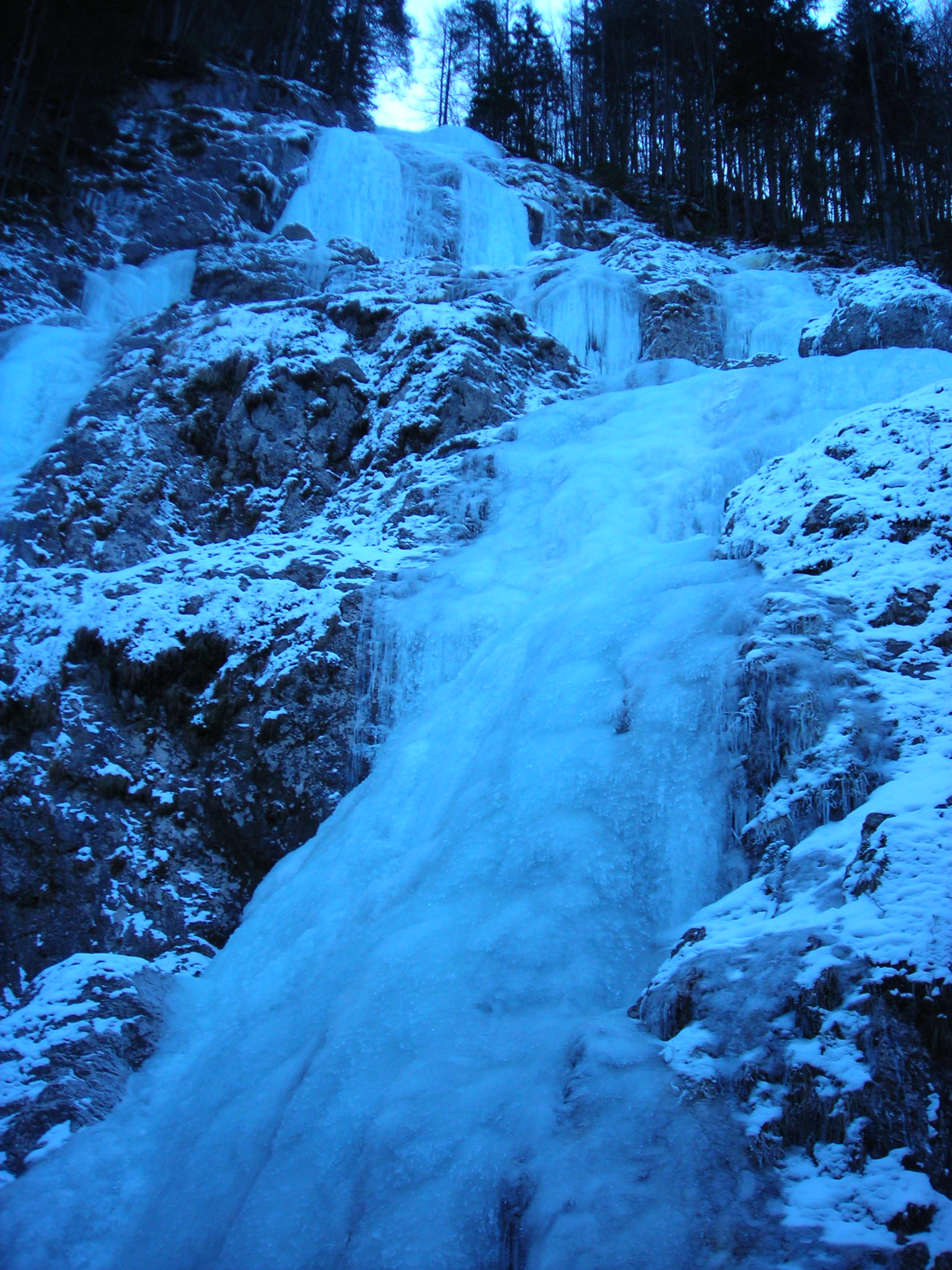 Pa poglejmo kaj ponuja Velunjski graben. Poglej tamle levo sta dva potočka. Ja prvi malo prepoložen, drugi sicer bolj strmi a presuh, ja tale na desni bi pa kar bil. Glej, glej, tamle za avtobusno bi znalo bit kaj konkretnega. Danes nas čas preganja, zato se zmenimo za ponedeljkovo popoldansko akcijo. Popoldan, ko sonce že skoraj zahaja in se prikaže lunca v vsej svoji čarobni, polni okrogli obliki, se mi 4je; Sergej, Pavli, Klavdija in Tanja odpravimo na raziskovanje žuborečih potočkov, ki jih je zategla zima, spravila v trdo obliko, beri led. Vstop v prvi slap je kar ob cesti in že takoj se postavi vertikalno (80 Stopinj). S plezanjem začne Pavli in pove, da je led odličen.