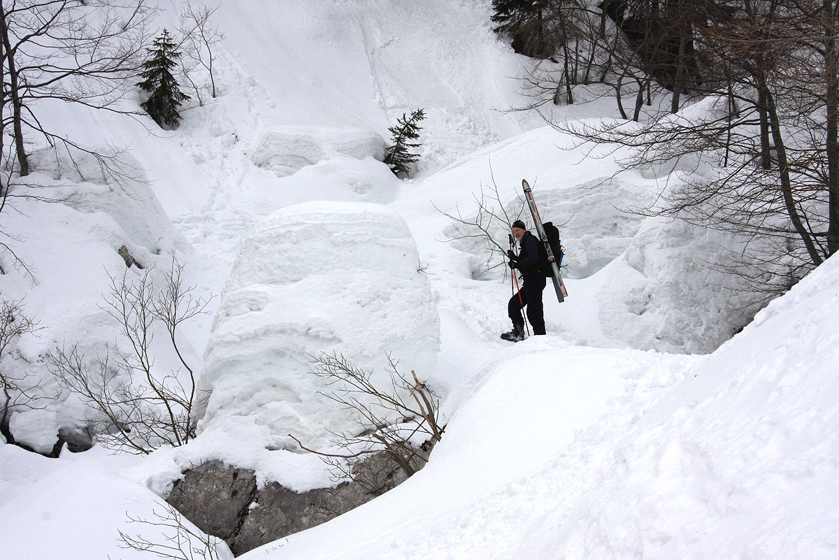 Nadaljni vzpon je potekal po poledenelem snegu vse do slapu Rinka.