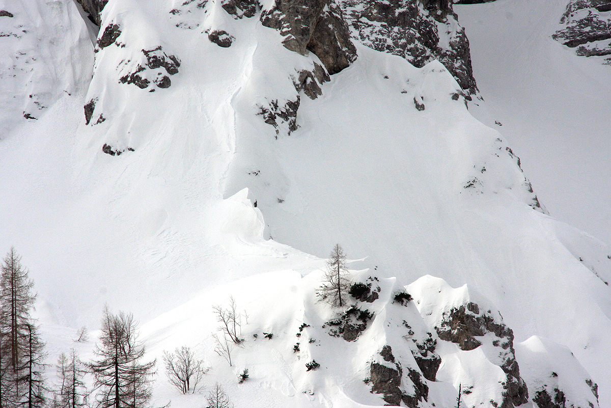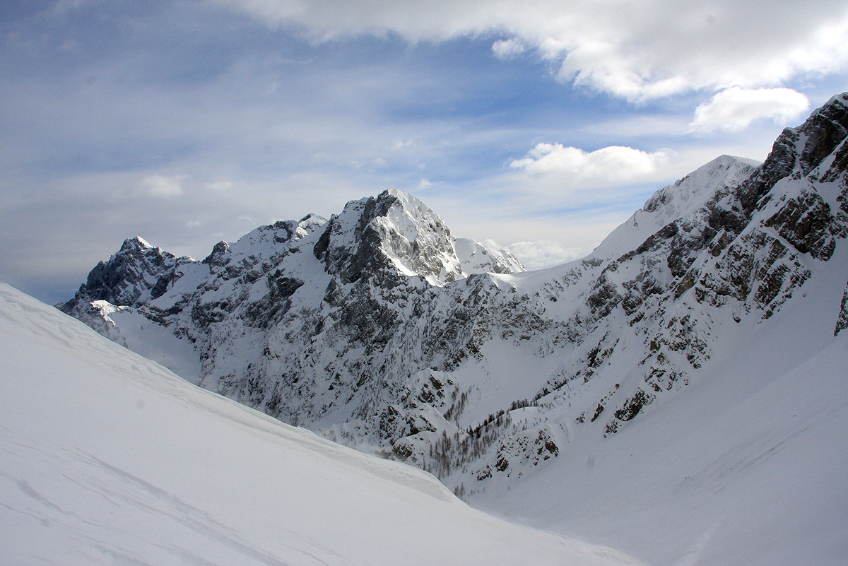 Bila sva tik pod sedlom, ko je pričelo orkansko pihati, da je sneg je kar dvigalo iz tal. Tudi najine sledi je sproti poravnavalo. Še preden si se obrnil nazaj, jih že ni bilo več. Na nebo so se pripodili napovedani temni oblaki in z njimi snežna nevihta, zato sva jo urno odkurila nazaj proti dolini.