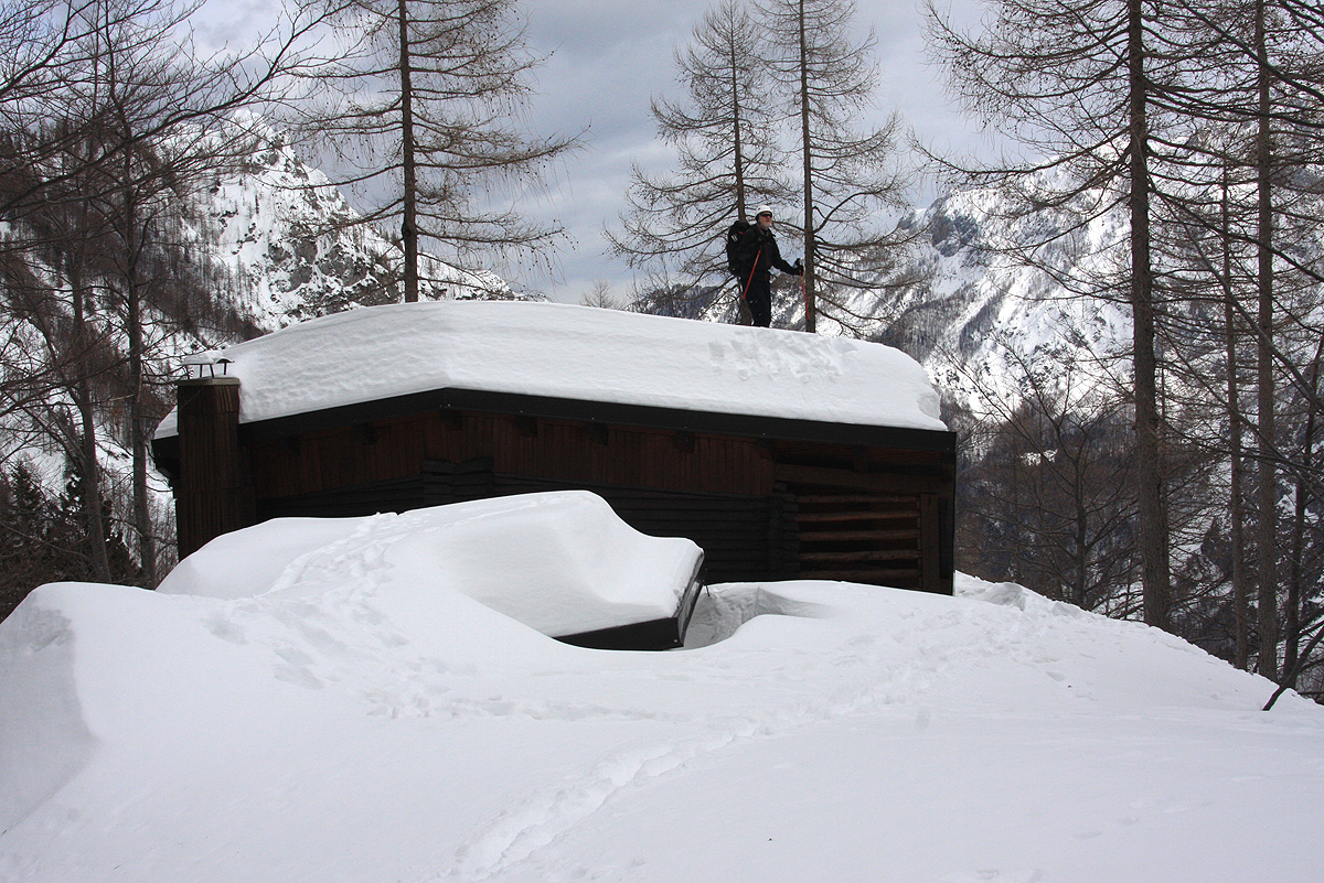 V torek sva se s Pavlom že zgodaj zjutraj napotila proti Logarski dolini. Tokratni cilj je bilo Savinjsko sedlo s turnimi smučmi. Z avtom nisva prišla kaj daleč, je pa bil zato vzpon po tekaški progi manj naporen. Na zadnjem – krožnem parkirišču so naju pričakali zakopani prometni znaki in napol porušena hiša nad parkiriščem.