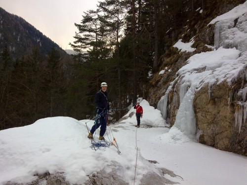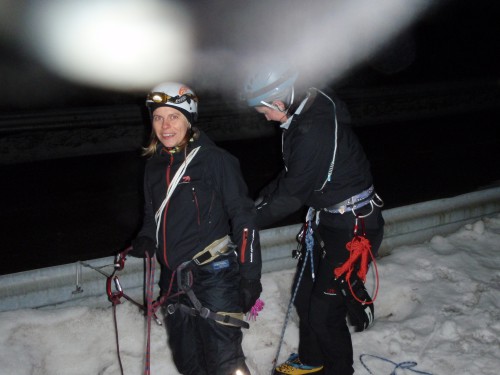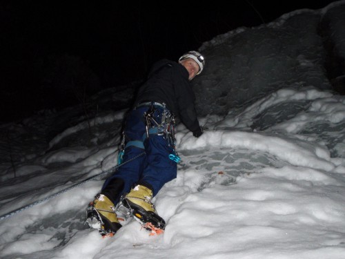 Seveda s pomočjo Pavlija in Sergeja. Spust v dolino je že načenjala tema, ki se je začela naglo spuščati in nam do prihoda do avta prinesla črno noč posuto z zvezdami. Plezarije pa še ni bilo konec. Drugi del plezarije oziroma naslednji slap je prav strpno čakal na vrsto. Kljub temi nam ni ušel iz rok! V polni “bojni opremi” (če odštejemo dereze) smo se nabasali v avto in se odpeljali proti Avtocesti. Parkirali (nekako) tik ob vznožju slapu in štartali s čelkami na glavi. Mimoidoči avtomobili so se najbrž malo čudili vesoljcem ob cesti ampak, pa kaj, saj je bil pust! Avtocesta je bila precej zasuta s snegom ampak je vseeno imela svoj čar. Noč ima svojo moč, vsekakor, sploh če te spremlja zvezdno nebo. Dol grede, sredi abzajla smo začutili, da je temperatura (končno) padla tja do nule, če ne še kakšno stopinjo nižje. Super, bo še za plezat! Dan in večer smo zaključili in nikakor pozabili na pustno posvetilo – nazdravili s krofom z rahlo zamrznjeno marmelado! Še več takšnih dogodkov ali bolje rečeno, več takšne hrane za dušo!