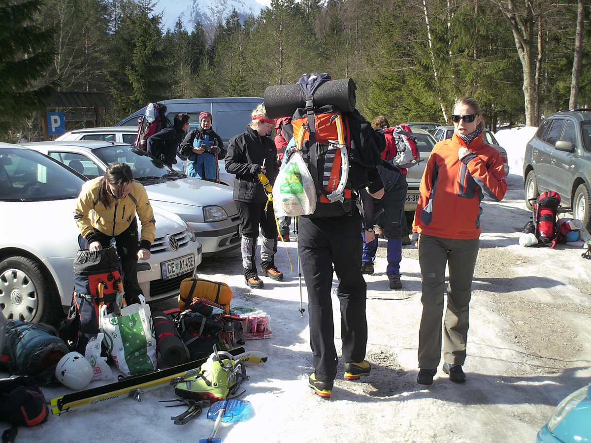 In zgodilo se je. V soboto zjutraj, smo se zbrali na našem stalnem zbirališču in se odpeljali proti Mozirju. V nahrbtnike smo dodali še nekaj uteži v obliki zelenih in rdečih pločevink in par hlebcev kruha – same kalorije torej. Parkirane avte smo pustili na sončku in odkorakali po zasneženi/pomrznjeni cesti. Ker je bil stric v rdečem kanguju in drugi stric na motornih saneh neusmiljen do štopark (beri: naših tečajnic) ob cesti, ostali niti poskusili nismo svoje sreče. Na spodnji postaji tovorne žičnice smo optimistično opazovali, kako se je pripeljala košara k nam v dolino v upanju, da bomo odkorakali do koče pol lažji. Tako so (predvsem) nekatere raztovorile nahrbtnike, ostali pa smo “dali” pot pod noge. Sonce je sijalo s svojo celo močjo in dan je bil prečudovit. Kot se je izkazalo, nas je večina ubrala najkrajšo pot proti domu. Kar čez majhno “grapico”, ki je bila za marsikoga, ki po snegu še ni hodil po takih strminah, nekaj zelo avanturističnega. Ostale tri tečajnice so jo mahnile po klasični poti, saj so bile natovorjene kot mule. Tovorna žičnica namreč ni delala in tako je bilo potrebno prinesti vse lastnoročno do koče.