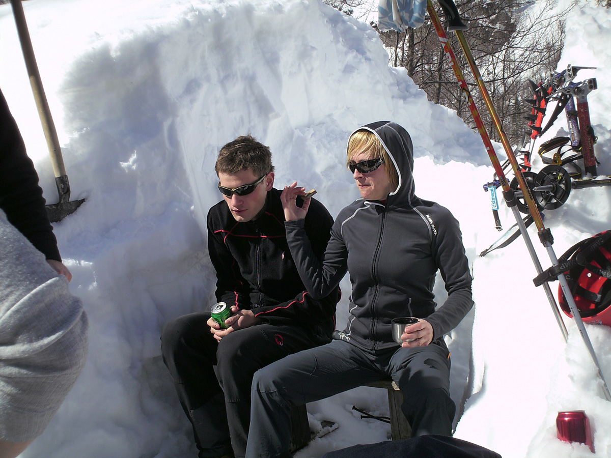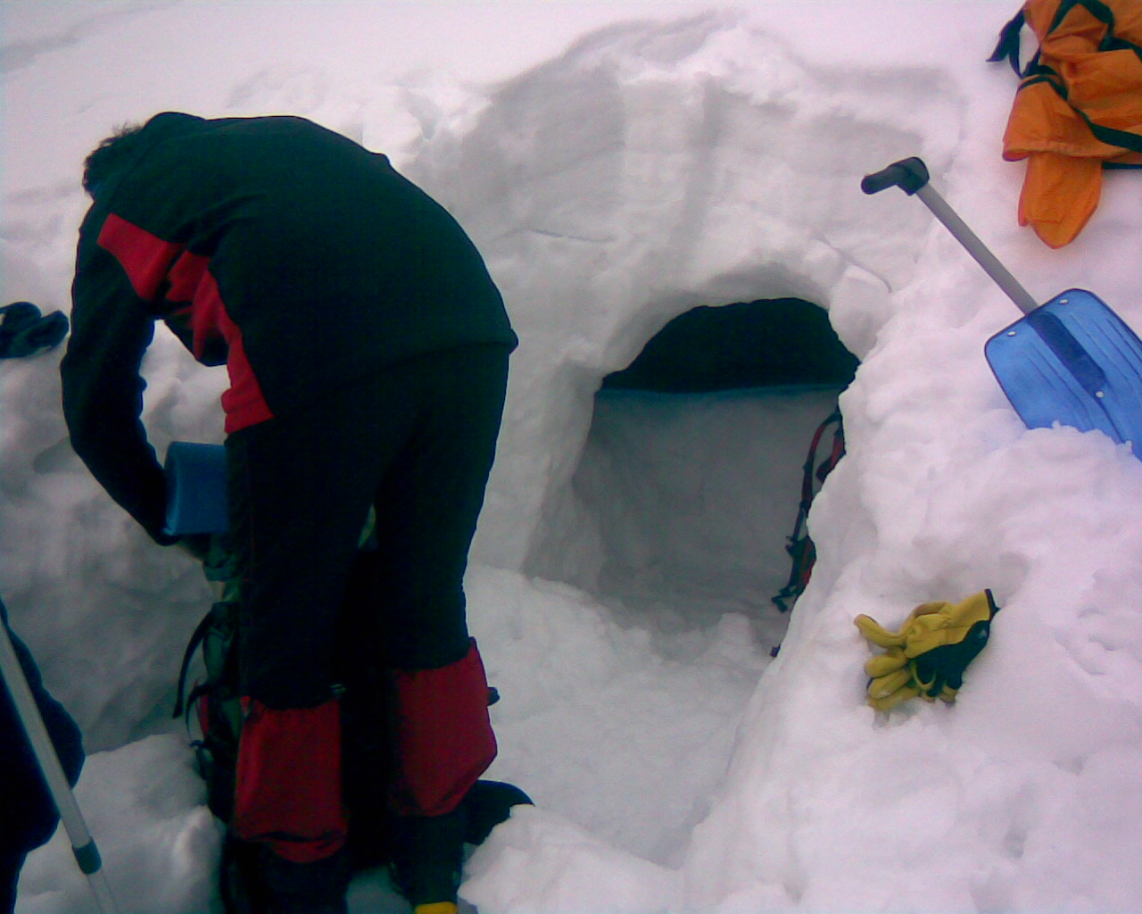 Lokacijo snežnih lukenj smo izbrali v zavetju pred plazovi, v dovolj globokem, že predelanem snegu. Vsi polni pričakovanj smo se razdellili v male skupine. S sondami smo preverili globino snega in pričeli z delom. Hitro se je izkazalo, da prenočišča ne bodo gotova v pol ure. Po mojih grobih ocenah smo kopali nekje od šeste ure, pa do desete ali enajste. Da bi bilo kopanje bolj zanimivo, so nekateri metali velike kose snega na druge. Seveda ne za nalašč – slaba izbira lokacije spodnjih. Drugim lopata ni in ni hotela ostati v rokah, tretjim jo je uspelo celo zlomili…