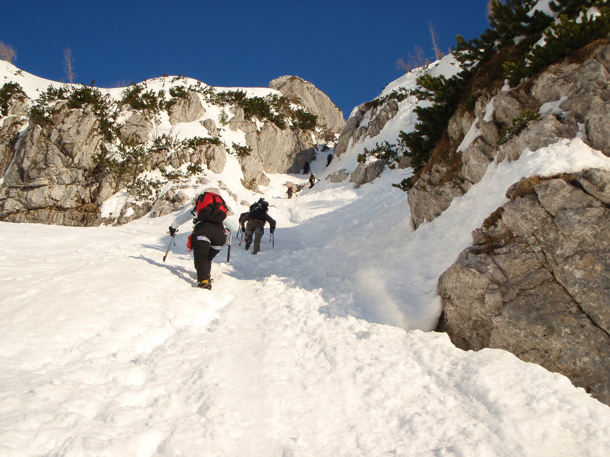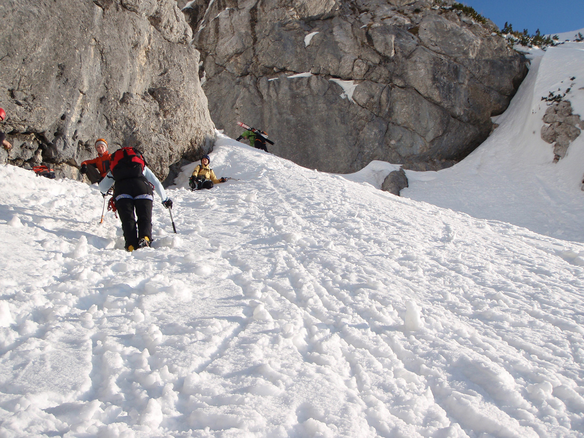 Noč v bivaku je bila ze ene precej dapljša kot za druge, a vsi smo jo preživeli brez posledic in se zbudili v prečudovito jutro. Od daleč smo lahko opazovali, kako sonce počasi osvetljuje vrhove in pobočja. Ob šestih zjutraj smo krenili proti dopoldanska grapi, si nataknili dereze in zagrabili za cepine. Prva skupina je izklesala stope in nas (drugo skupino) posipala z manjšimi in večjimi kosi ledu. Prvič sem občutil dejansko korist od uporabe čelade. Bil sem zelo vesel, da jo imam na glavi. Grapa, sestavljena iz dveh delov, je bila precej strma. Predvseem za tiste, ki takih prehodov še niso lezli. Na vrh smo ponosno “prikljuvali” čisto vsi in z nasmejanimi obrazi za trenutek sedli v sneg.