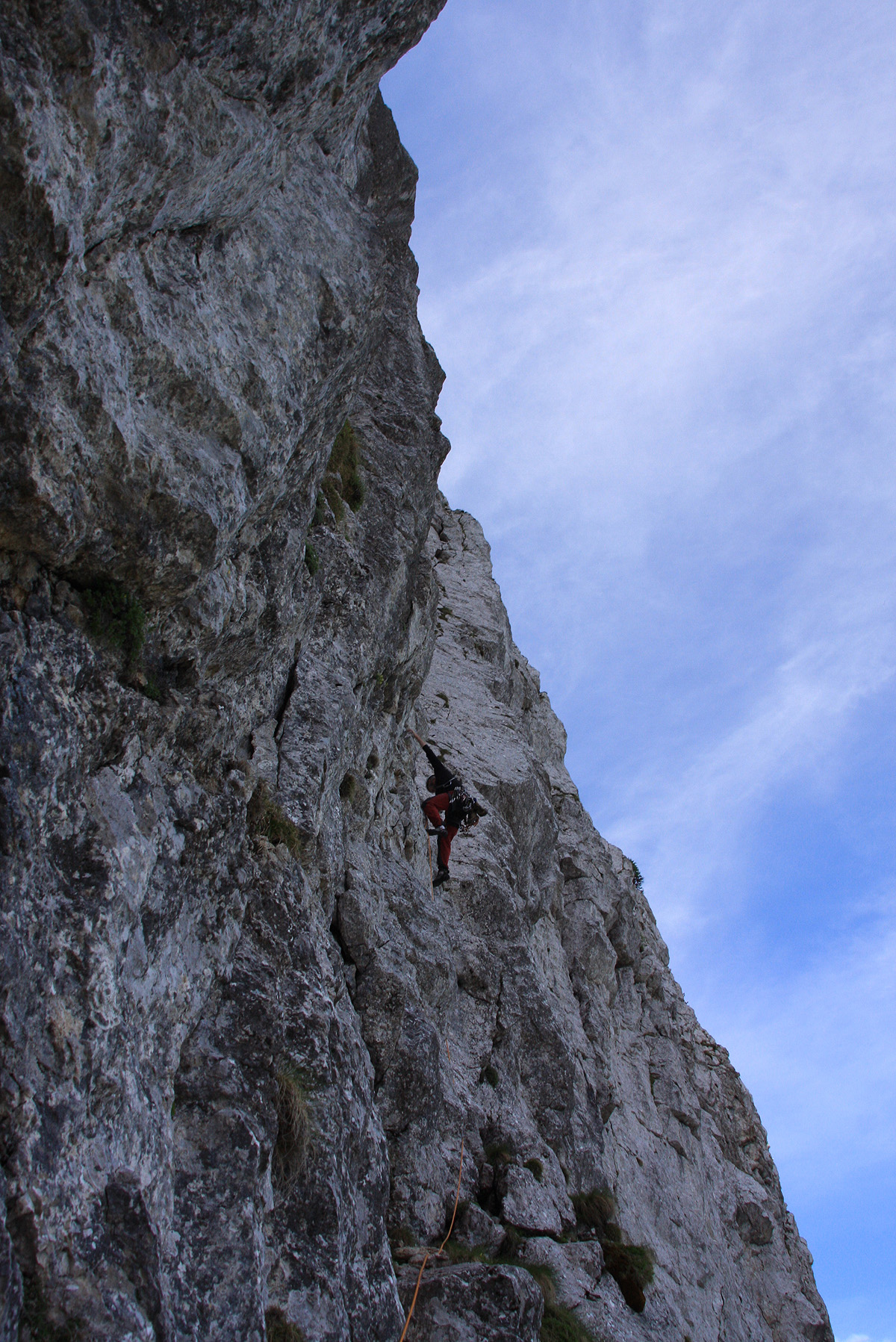 Zima je letos očitno naredila veliko škode tudi v plezalnih smereh. Tu in tam se prebijamo čez velike luske, ki so kar odstopile od matične skale in kot da komaj čakajo, da jih nekdo malce zaniha, da bodo z njim vred poletele v globel. Že prehodi čez tako napokane dele stene zahtevajo prefinjen občutek v rokah in nogah, a zabijanje klinov ob njih je adrenalinsko doživetje svoje vrste.