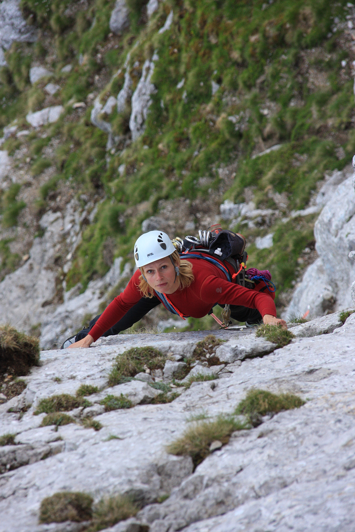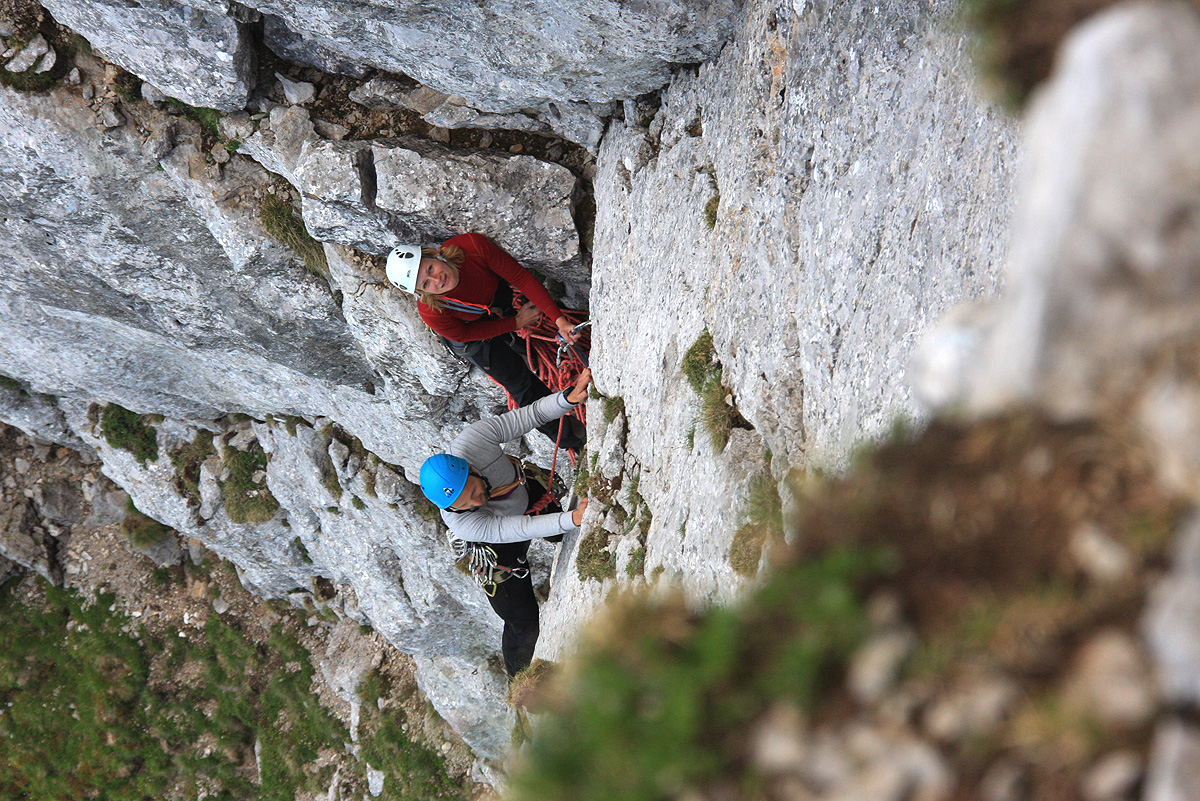 prideva do votline, si natakneva plezalke in v boj. Nekje spodaj pod nama sva iz smeri Grohota sišala Tanjo in Martina in ni bilo dolgo ko sta že bila za nama.