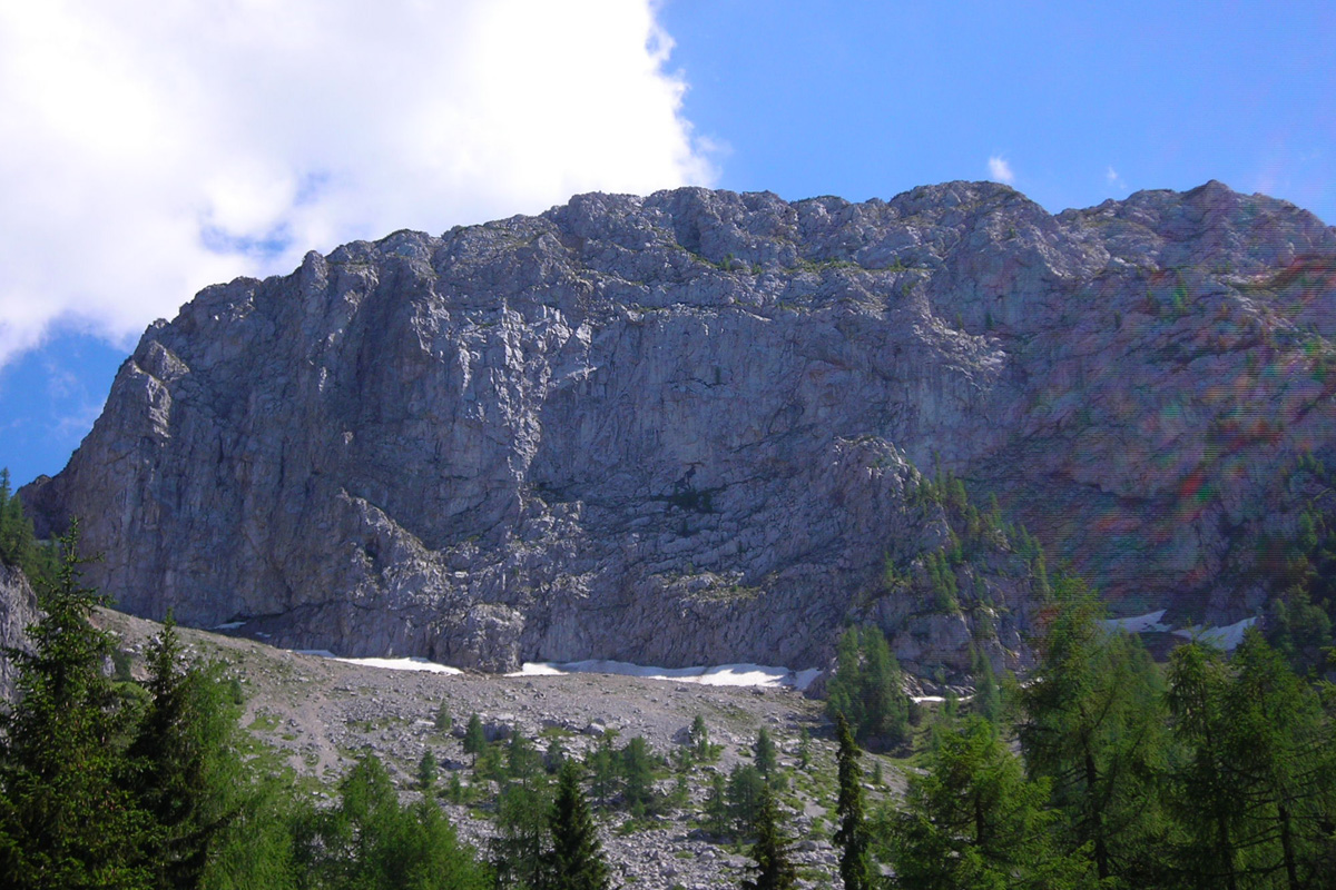 Sam vstop v smer orientacijsko ni težaven, a daljše prečenje zdrobljenega in blatnega sveta me je bolj spominjalo na izpostavljen sprehod čez zorano njivo, kot pa na plezarijo. Po prvem raztežaju