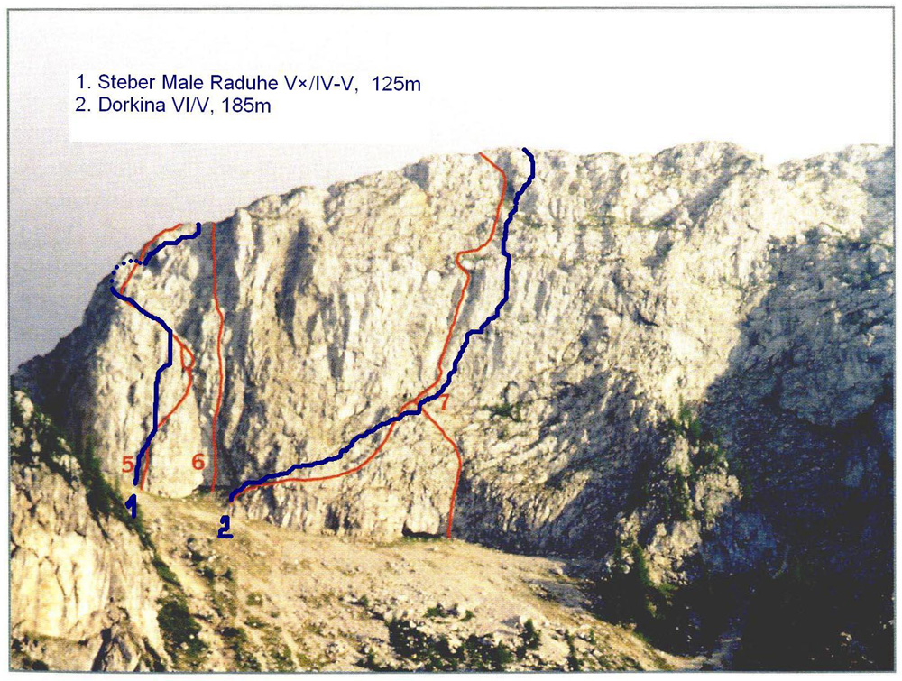 Odločili smo se, da se najprej preizkusimo v nekoliko lažji smeri Steber Male Raduhe (V+). Že po prvih nekaj metrih se je izkazalo, da je ne bomo v tej smeri prav nič poceni odnesli in na dveh mestih, se je bilo potrebno kar pošteno potruditi. Toda bila je lepa smer, konstantno težka, s presenetljivo dobro skalo. Po kratkem okrepčilu, seveda domači pršut s primorske ni manjkal, smo se preizkusili v nekoliko težji smeri – Dorkina smer (VI). Že dostop nam jo je nekoliko zagodel (predvsem Primorcu). Potikali smo se po krušljivih policah, mokrih travah in človek se kar nekoliko odahne, ko se naveže na vrv. Prve težave so se pojavile v prvem resnem raztežaju, ko je sledila prečka ocenjena s šestico, in presenetljivo veliko “lufta” pod nogami. Težavnost ni popustila niti v naslednjem raztežaju, ko sva z doktorjem zadaj pošteno sopihala in bentila nad problemi. Toda imela sva dobrega vodjo, ki naju je izvrstno vodil prek vseh pasti. Na vrhu je sledil še nujen stisk roke, kramljanje pa smo prestavili v kočo ob mrzlem laškem pivu, kot se spodobi.