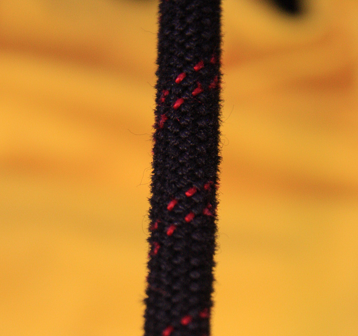 Po pol leta plezanja z njim počasi dobivam občutek, da je moja draga vrv (z dodatno zunanjo zaščito) vedno bolj kosmata. Ali so to samo prividi, ali se res kaj čudnega dogaja z njo? Pogledam jo pod mikroskopom in ugotovim, da so zunanje nitke plašča mestoma potrgane – cvetijo tu in tam kot bi jih odrezal z britvico. Ni še hudo, ampak na manj kot leto dni stari vrvi je to zelo nenavadno. Pomislim na ostro skalo v Paklenici, vendar tam smo z njo lezli samo dva dni. Hm…