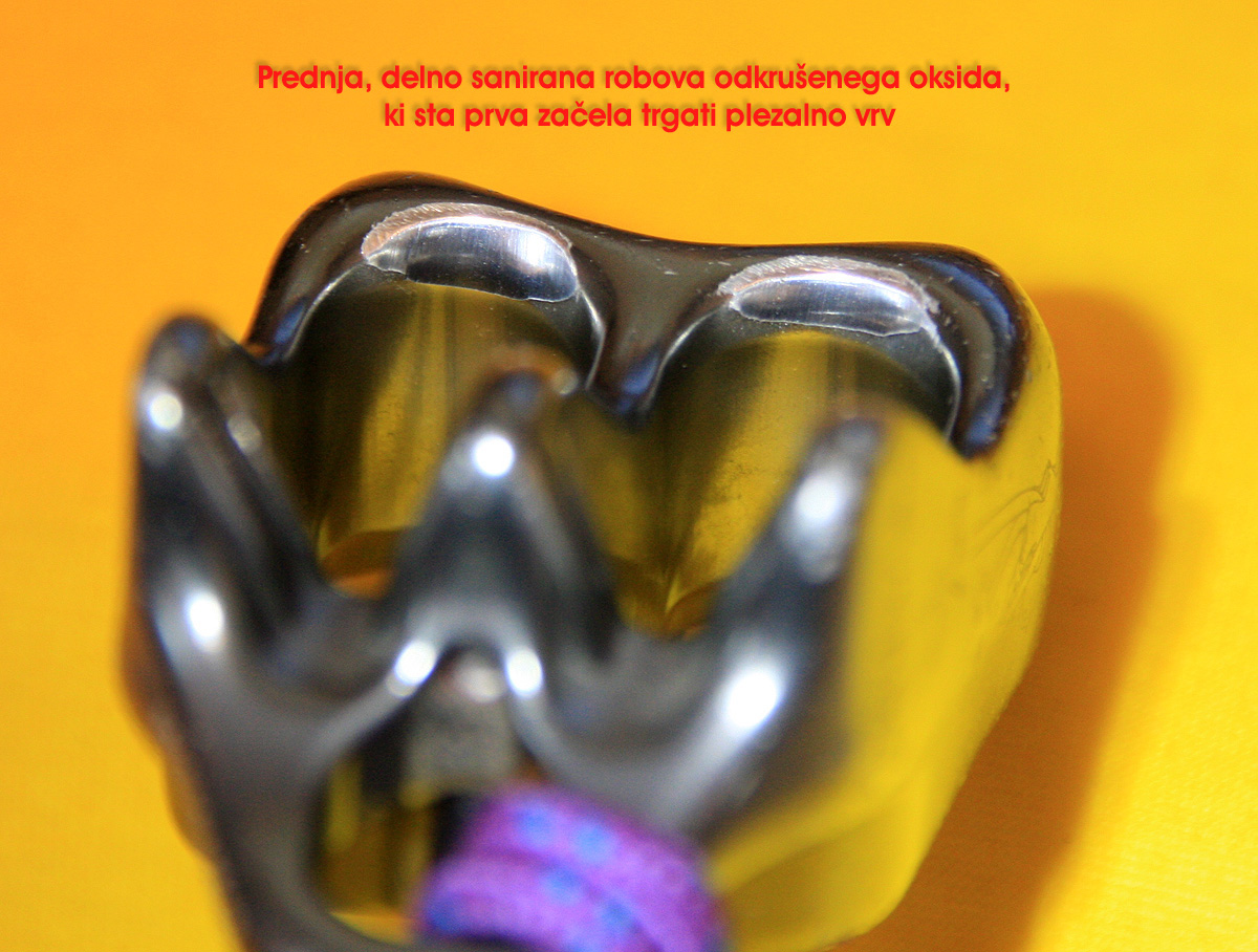 S “predelavo” odkrušenih in odbrušenih površin zadovoljen se napotim v plezališče. Zaenkrat izgleda vse vredu. A glej ga zlomka, leto dni po nakupu je pri spustih po vrvi Reverso-3 vse bolj naprašen s koščki odstruganih laskov, sedaj že leto in pol stare vrvi. Popravljeni odbrušeni površini sta lepi, sjajni in brez robov, a kaj ko so se ostri robovi pojavili v obeh zagozdah za izstopno vrv, pa na drugi strani pod njimi še bolj ostra in za vrv zelo nevarna robova. A to še ni vse, ta ista vrv sedaj cveti kot bi jo intenzivno uporabljal pet, šest, sedem let!
