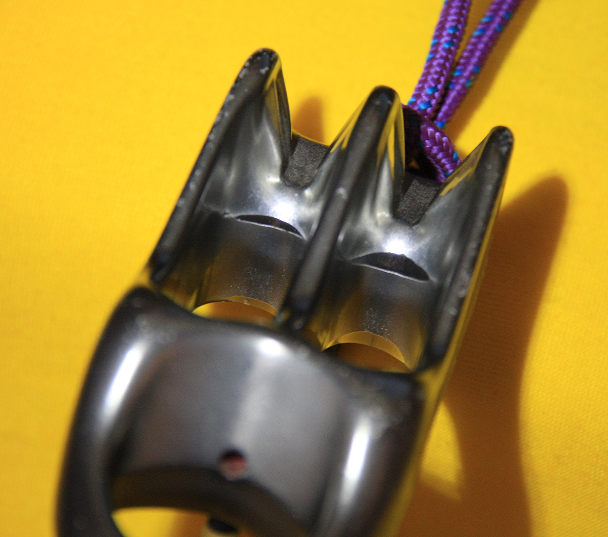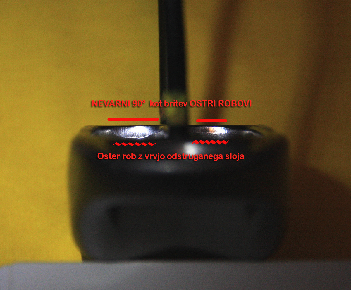 Nič hudega sluteč vzamem pod drobnogled še pol mlajši Reverso-3. Najprej pade v oči svetleč odkrušen in mestoma odbrušen del robov kjer obremenjena vrv prehaja navzgor (plezalčeva stran). Vredu, to da “odpihne” sloj vrhnjega oksida (eloksiranega nanosa) je ob tolikšnem trenju verjetno normalno, si rečem. A ko pogledam pod mikroskopom vidim kot britev ostre in pre-debele robove povsod, kjer svetla sredica prehaja v zunanjo eluksacijo. Ko potem poizkusim prehod s prstom in nohtom je takoj jasno zakaj nova vrv cveti. Ostri robovi elukasacije so tako ostri, da je čudno da plašč vrvi ni še bolj poškodovan. Glede na to, da je doma nekaj strojev in orodij za obdelavo kovin ter mi tovrstna dela niso neznanka, se podstopim piljenja in poliranja obeh ostrih, z vrvjo odbrušenih prehodov na Reversu-3. To storim kakšen milimeter več spodaj in zgoraj, se pravi v področje kamor naj vrv nebi segla pri manevrih varovanja. Za konec dam varovalo še enkrat pod mikroskop, da bo ja vse vredu.