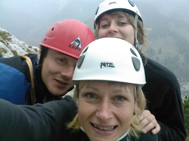 20091001_polona-kamin-raduhaV petek sva s Polono plezali v Kaminu pri Durcah. Jaz zagovarjam teorijo, po desni, v kaminu do svedrovca, Polona me prepričuje, po levi je lažje. Ne poslušam je in se nekako čudno gozdim, preklinjam in po tihem razmišljam, mogoče ima prav. Ko le vpnem, s ptičje perspektive opazujem »Polonino smer« ampak me ne prepriča. Bom poizkusila naslednjič, si rečem in hitim novim problemom naproti. Pravzaprav problemov ni, je le lepa plezarija. Zadnji »cug« potegne Polona in že sva pod naslednjo smerjo ZZ. Tukaj se v zadnjem raztežaju odločiva, da izbereva malo daljšo izstopno varianto, skozi preduh oziroma okno. Okna nisva našli, sva pa krstili nove kline, ki so prav lepo peli. Zato ker so novi? Ne, zato ker znava dober zabijat 😉