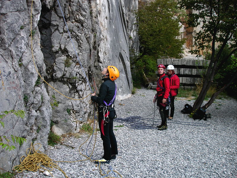 Ko se tako v soboto v Arji vasi pakiramo v avto, nebo ne kaže ravno prijazne podobe. Jutranjih pet stopinj, nebo prekrito s sivo oblačno odejo in za piko na i še rahle dež. Punci nista bili ravno prešerne volje in tam do Vranskega smo že pripravili plane B in C kaj početi v dežju na morju, če se že tako optimistično odpravljamo v dežju plezat. Vreme v Ljubljani še ni bilo prav nič boljše, na Lomu pa nas je čakala prva resna preizkušnja, kako priti do jutranjih poživil med kakšnima dvema avtobusoma upokojencev, ki so ravno ta sivi depresivni jesenski dan izbrali za izlet. Vendar Urška s prirojeno spretnostjo zavijuga med sivolasimi gospemi in gospodi, Tanja na hitro zasede prosto mizo in čez pet minut že uživamo ob jutranjih kavicah in čaju. Prva resna ovira na poti je premagana!