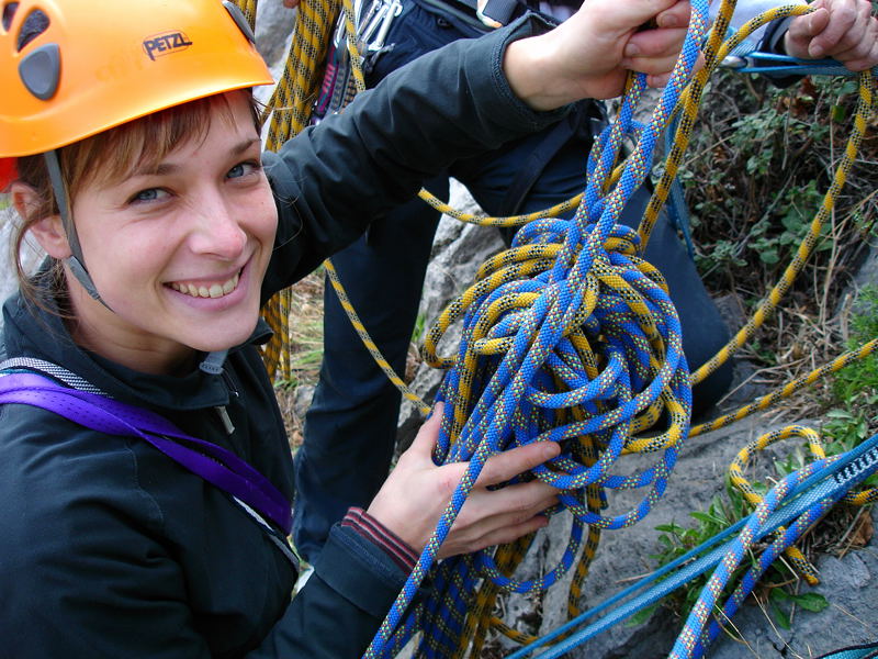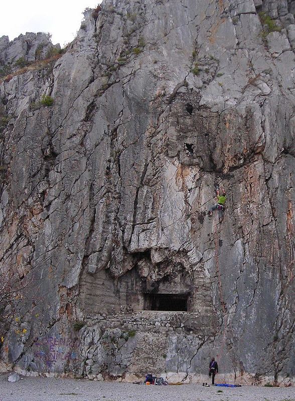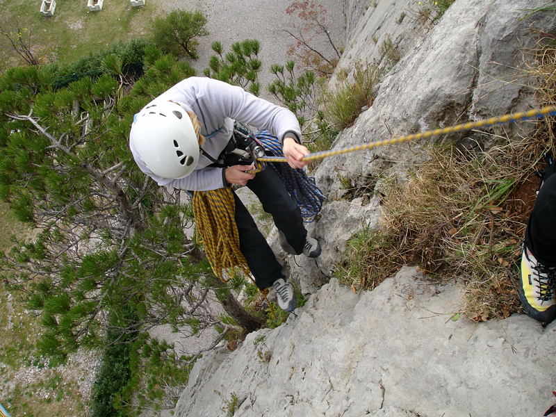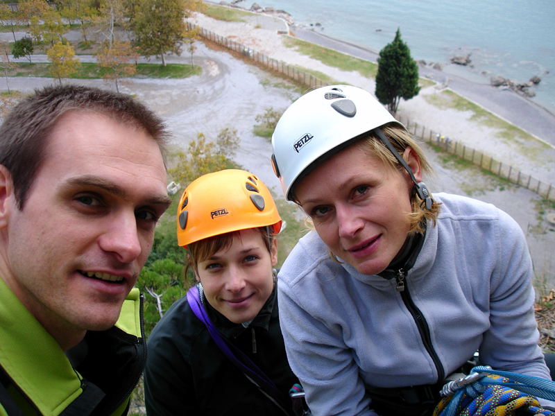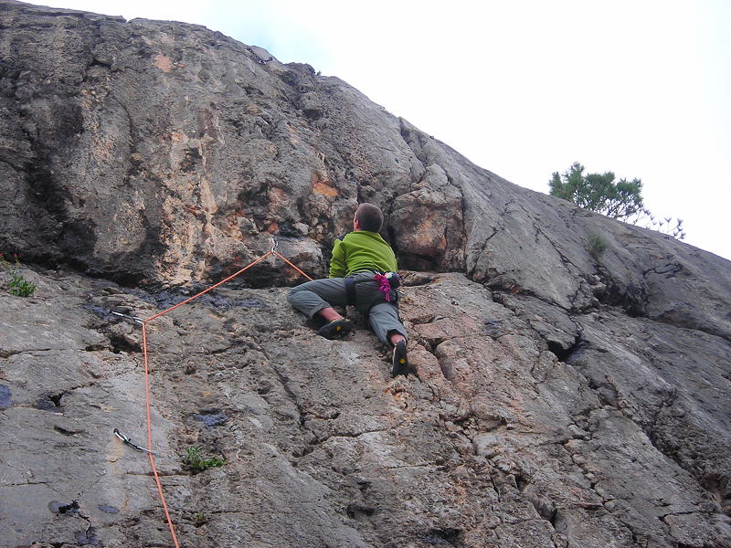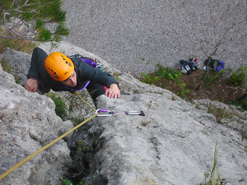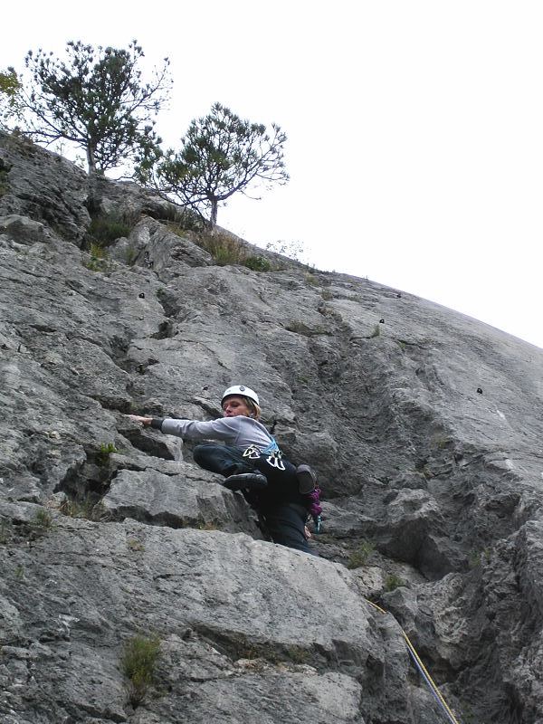 20091108_dsc05013Vsi skupaj smo zadovoljni z razčlenjeno in ostro skalo in malo presenečeni nad kar navitimi ocenami. Pozna se, da tu že od tridesetih let prejšnjega stoletja plezajo mojstri, kot je bil Emilio Comici, o čemer pričajo tudi zarjaveli klini, ki jih še tu in tam najdemo v razpokah v steni.