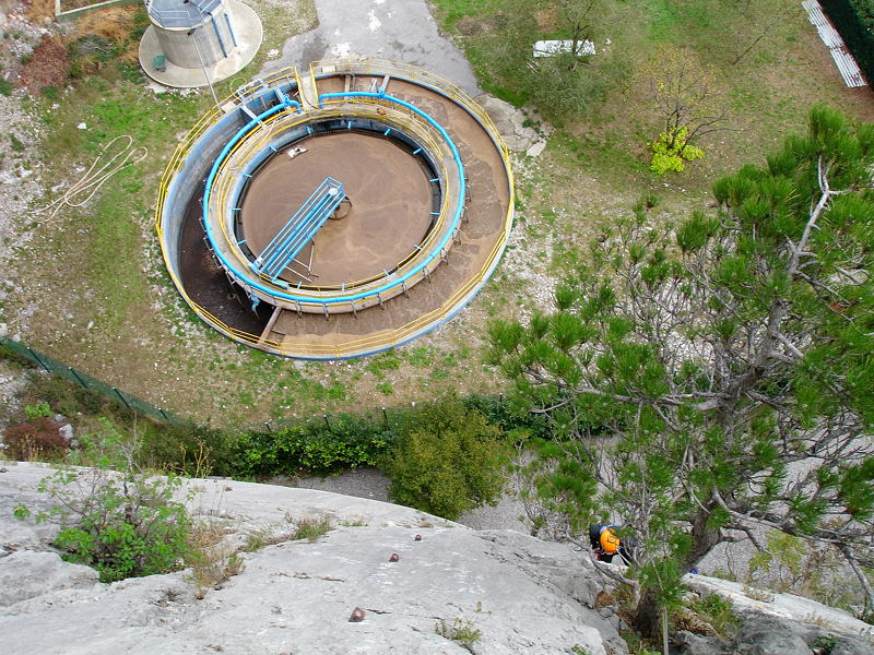 20091108_dsc05034ki je prav tako skoraj pod steno, ampak na srečo je ta dan skoraj nismo zavohali. Ti Italijani so pa res tapravi, če človek še razume da se pri gradnji čistilne naprave ne ozirajo na plezalce, ki itak nismo neka pomembna stranka, ni mi pa jasno kako to, da so jo postavili ob najlepšo urejeno plažo daleč naokoli. Očitno gostov lokalov ob obali prav tako ne moti, kot v soboto ni motila nas.