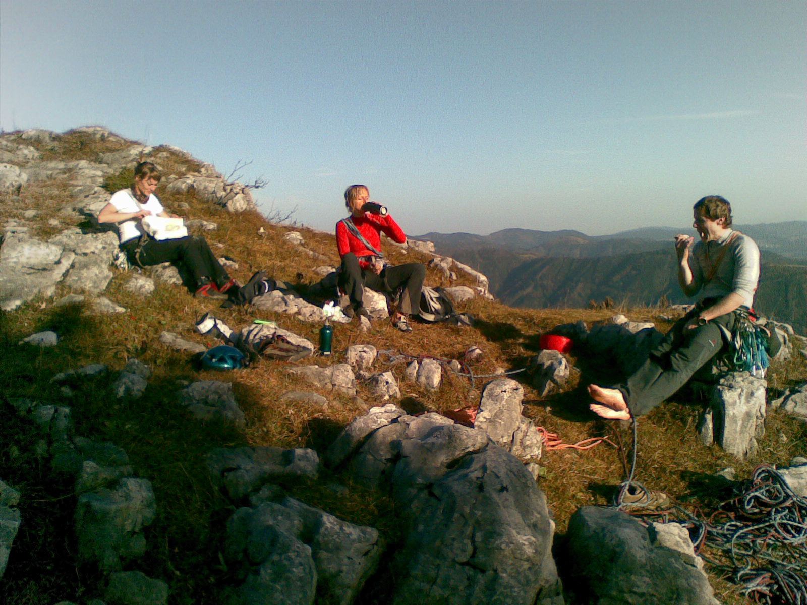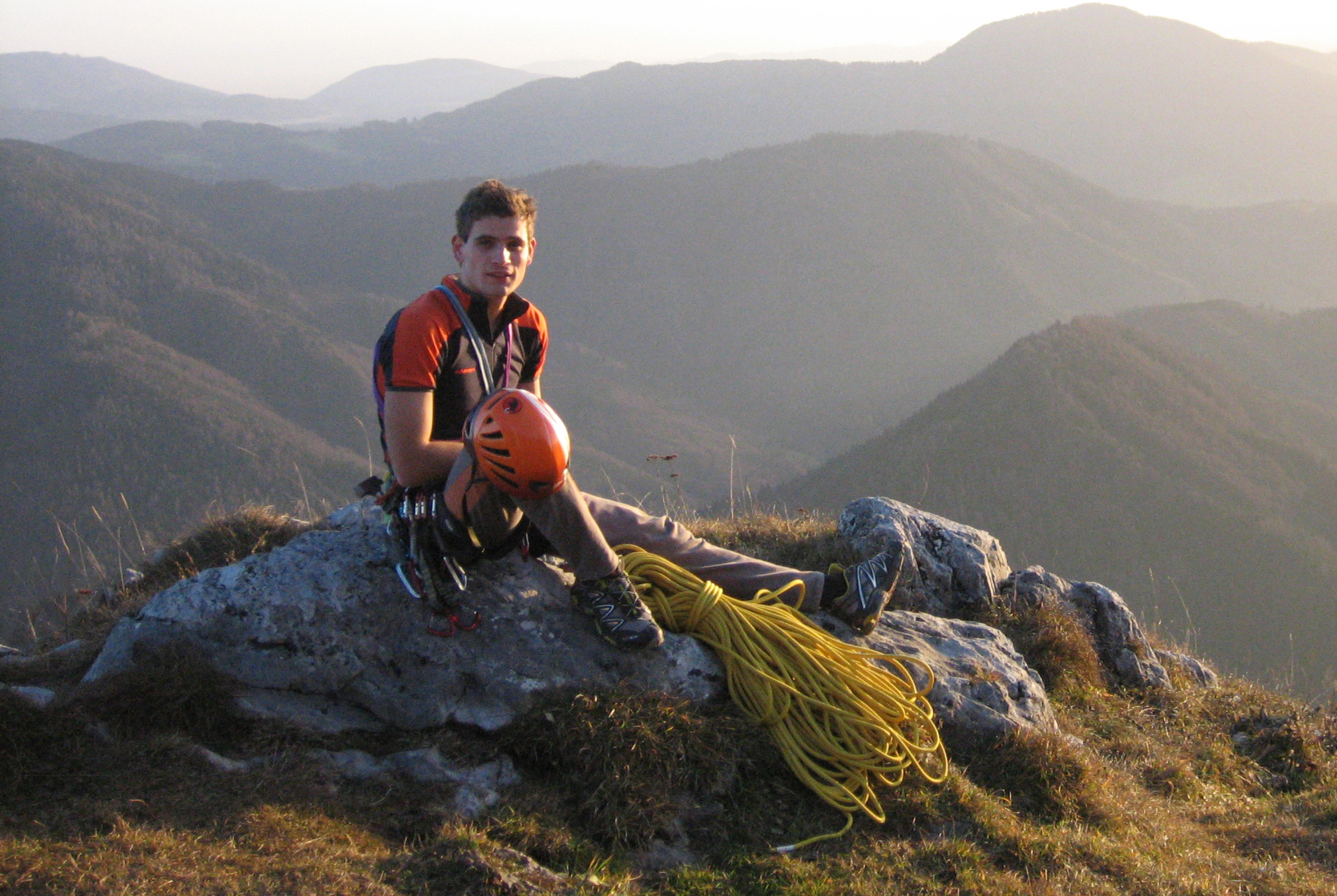 Ko sva prišla do vrha pa nisva imela časa, da bi lahko malo uživanja v prečudovitem razgledu, hitro sva se spustila in vstopila v novo najino smer Waschrumpel, ki ima oceno 6-. Za to smer pa sva porabila 2 uri in pol. Na vrhu pa naju je pričakal sanjski razgled. Sonce je že počasi zahajalo in pogled iz vrha je bil res prečudovit.
