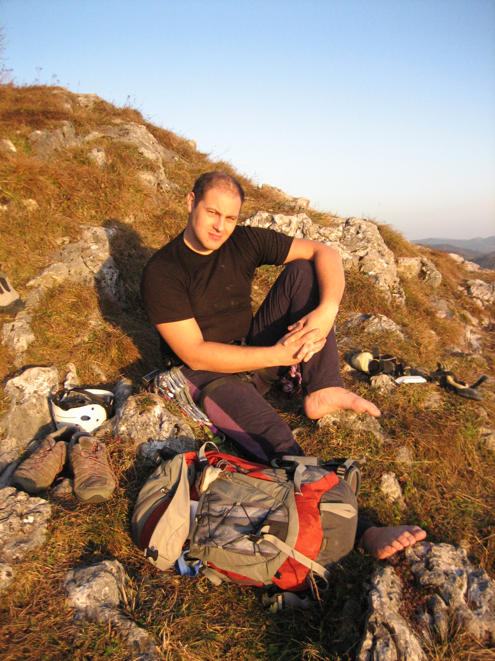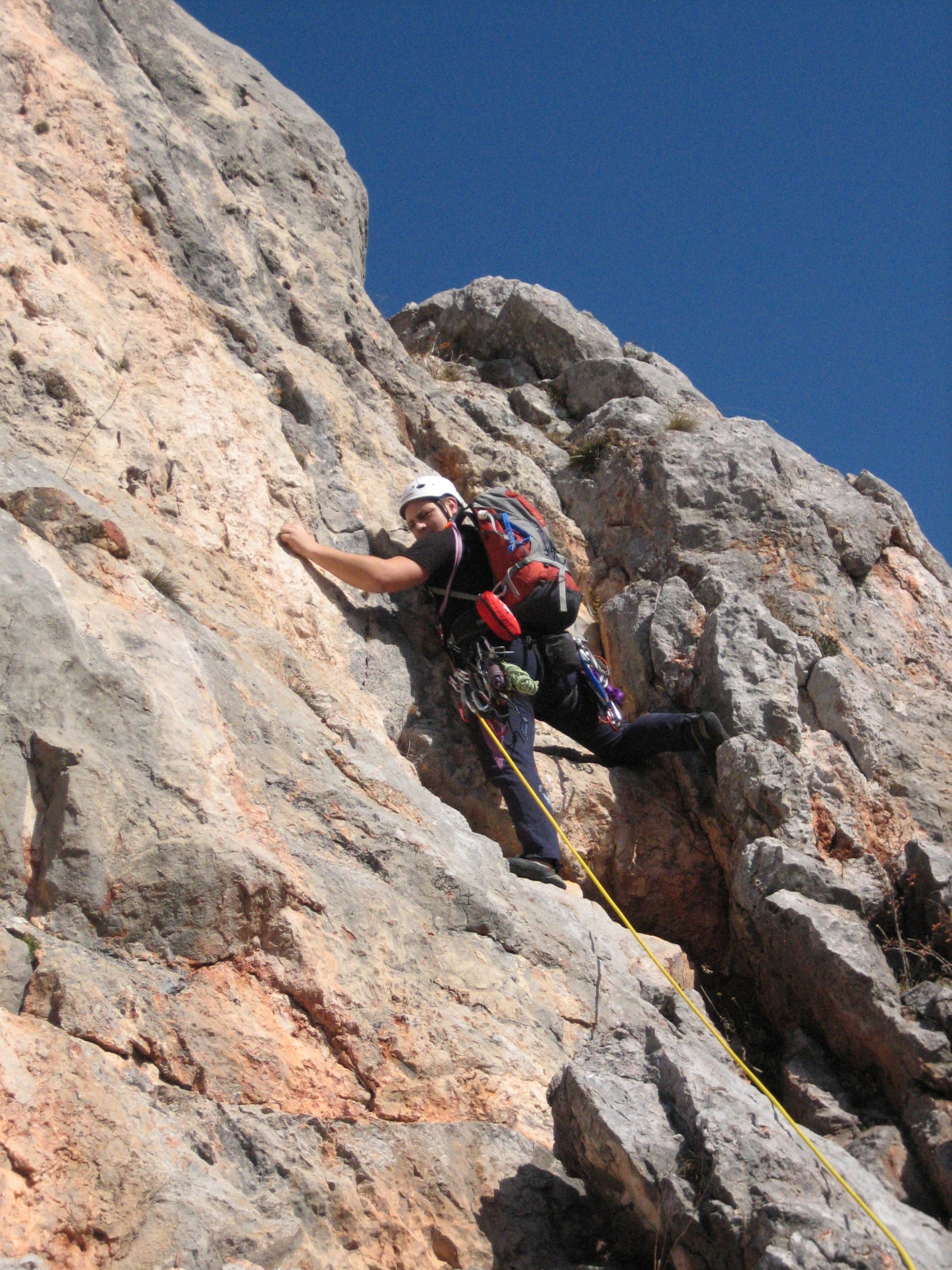 Hitro smo se opremili z robo in že smo hiteli proti steni. Že po nekaj minutah hoje smo vedeli da bo dan zelo hladen, a ko smo prispeli do ”ruzak placa” pa smo ugotovili da se zeloo motimo. Hladno jutro se je prevesilo v prečudovit in predvsem topel skoraj poletni dan. Z Rokom Apatom sva se odpravila proti najini želeni smeri Hünerleiter, ki je ocenjena z oceno 5. Smer je bila zelo lepa in sva jo preplezala kar hitro v 1 uri in pol.