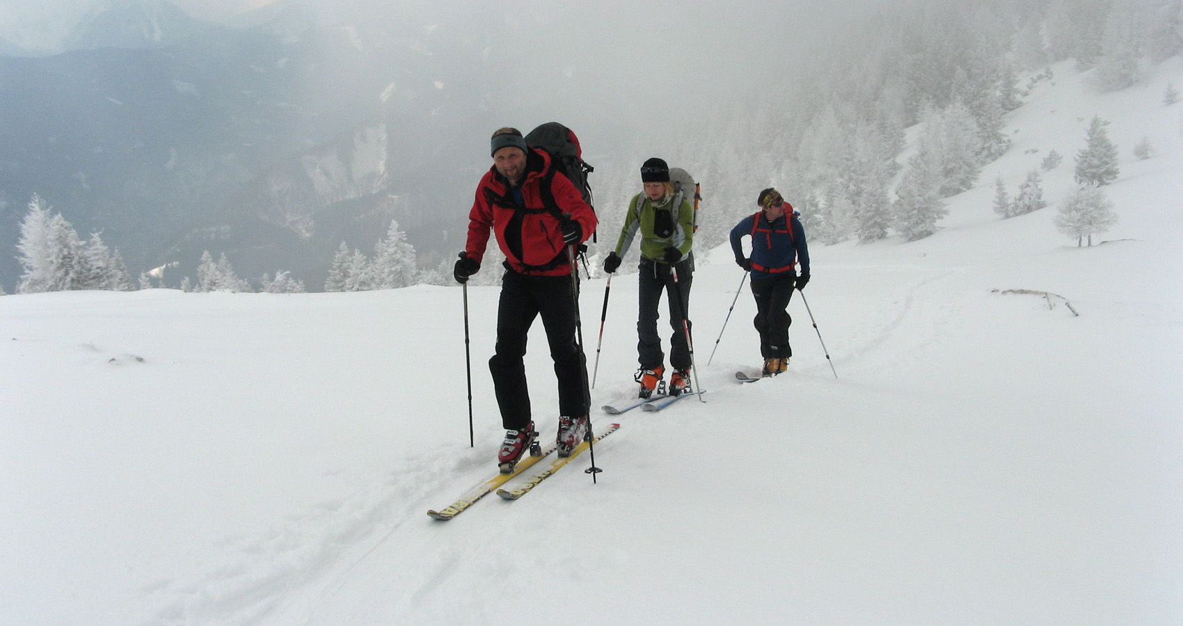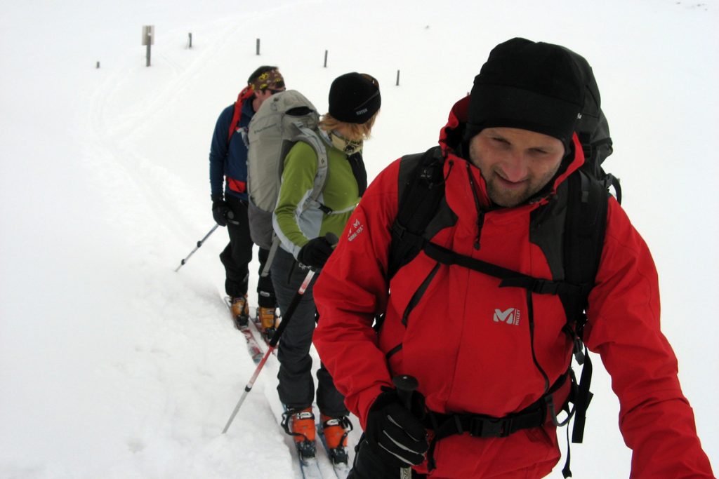 Sledile so priprave na vzpon, smučarske čevlje in smuči na noge, palice v roke, nahrbtnik na ramena. Obvezni sestavni del takšne ture je t.i. lavinski »trojček« (sonda, žolna, lopata). Skupaj smo takoj pred začetkom ture obnovili znanje iz kontrole delovanja lavinske žolne, naprave so na srečo delovale brezhibno.