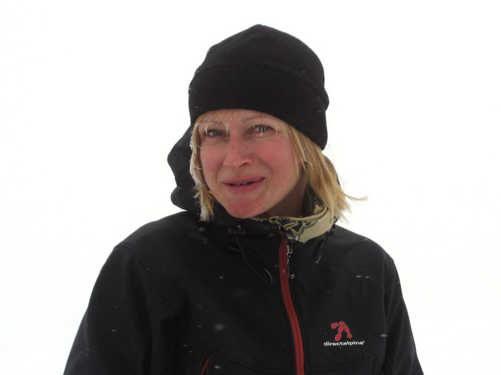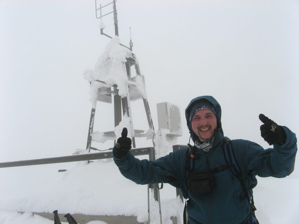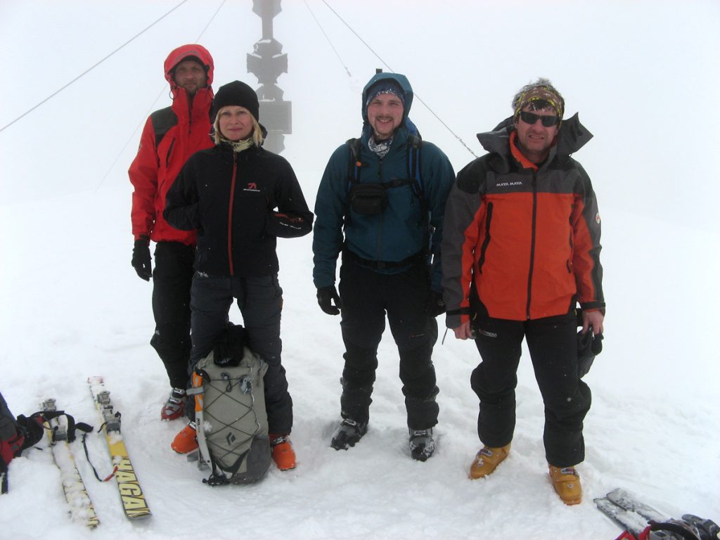 Lani jeseni smo na našem društvenem izletu (PD Ljubno ob Savinji) na vrh pripeljali večje število udeležencev, tako mi je bil teren kljub megli dobro poznan in smo brez večjih orientacijskih težav dosegli vrh Ojstrca. Na grebenu je bilo tudi bolj mrzlo, vlažna oblačila in pot na obrazu so takoj zmrznila, svoje je dodal še veter, ki je prenašal sneg. Na vrhu se nismo dolgo zadrževali, naredili smo nekaj fotografij, kože so romale v nahrbtnik, nase smo navlekli še nekaj dodatnih oblačil in smučarska očala.