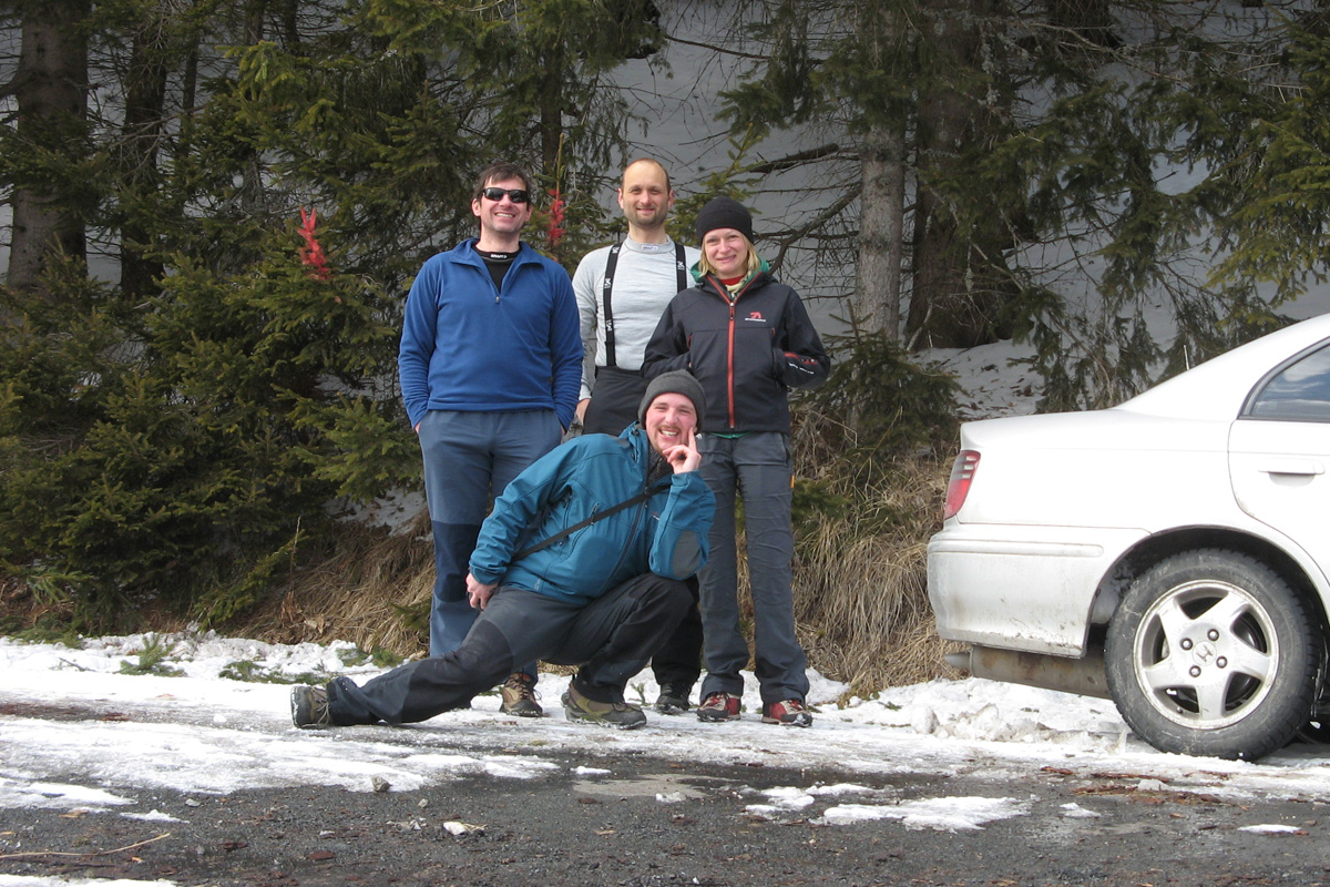 Že do izhodišča je bilo kar nekaj zanimivosti: nekateri s(m)o zamudili na dogovorjeno mesto, drugi so še zajtrkovali, večkrat smo se presedali iz avtomobila v avtomobil, prelagali, zlagali in nalagali opremo iz enega konca v drugega in nato ugibali koliko ovinkov nam bo pod Obirjem uspelo prevoziti, da bi se pripeljali čim višje.