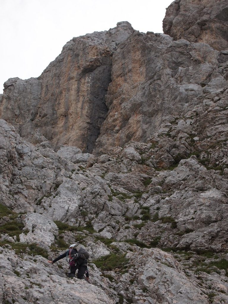 Vreme je bilo v soboto bolj tako tako, malo so se že nabirali oblaki pa malo je pihalo ampak sva si rekla bo že. Pod steno po kakšni uri pristopa sem potem ugotovil, da sem opis smeri in karto pozabil v avtu, kar je bilo malo nerodno, ker še nihče od naju ni hodil ali plezal okoli Prisojnika. Megleno sem se spomnil, da je smer dolga kakšnih 500 m, ocenjena nekje IV/III in da je nekje na drugi strani gore planinska pot za sestop.