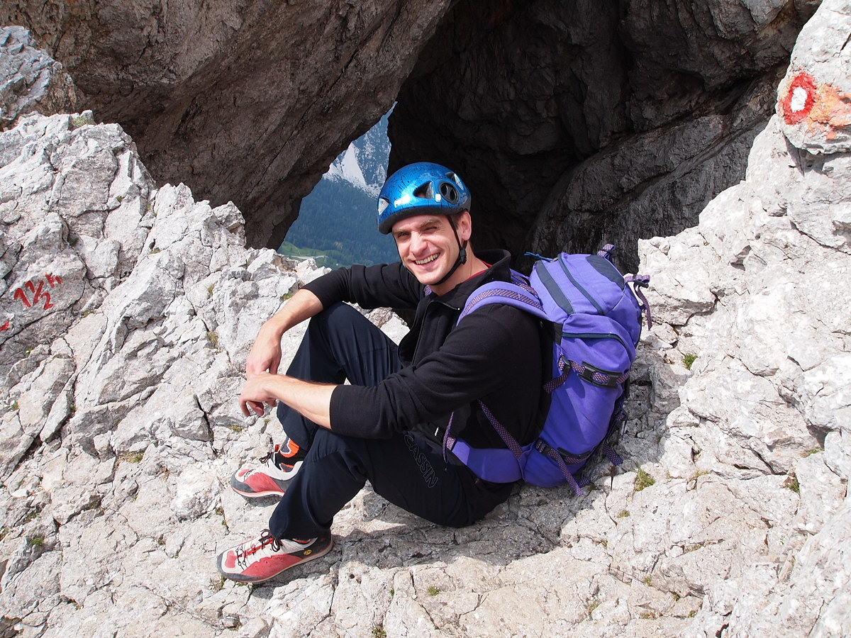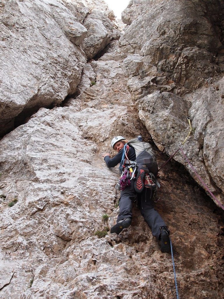 Po drugem cugu je svedrov zmanjkalo, zmanjkalo je tudi klinov, samo enega zarjavelega sva še našla, počasi pa je zmanjkovalo tudi navdušenja, ampak po kakšnih sedmih raztežajih sva le priplezala na en takšen strmi travnik, za katerega se je zdelo, da je že skoraj na vrhu.