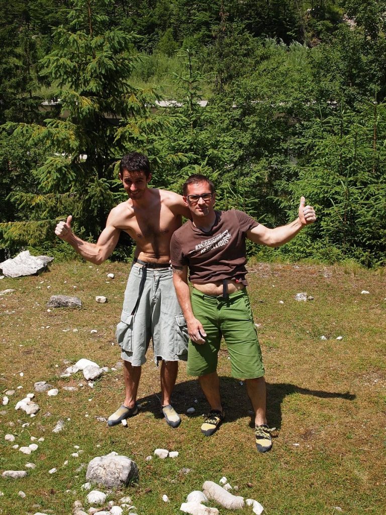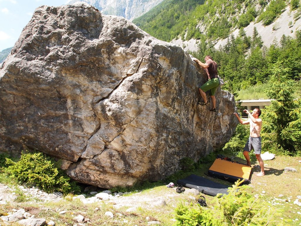 Zvečer sva se odpeljala v kamp Soča, kjer so že dva dni taborili Grudi, Damjan, Metka in Matija, privoščili smo si odlično večerjo (pohvale Damjanu za kuhanje) in kakšno pivo in vino. Naslednji dan smo vsi prav počasi vstali, s Tanjo pa sva okrog dvanajstih ugotovila, da je morda že res malo pozno za plezanje v hribih. Zato sva izkoristila priložnost in šla s športnoplezalno ekipo plezat na balvane v Trento.