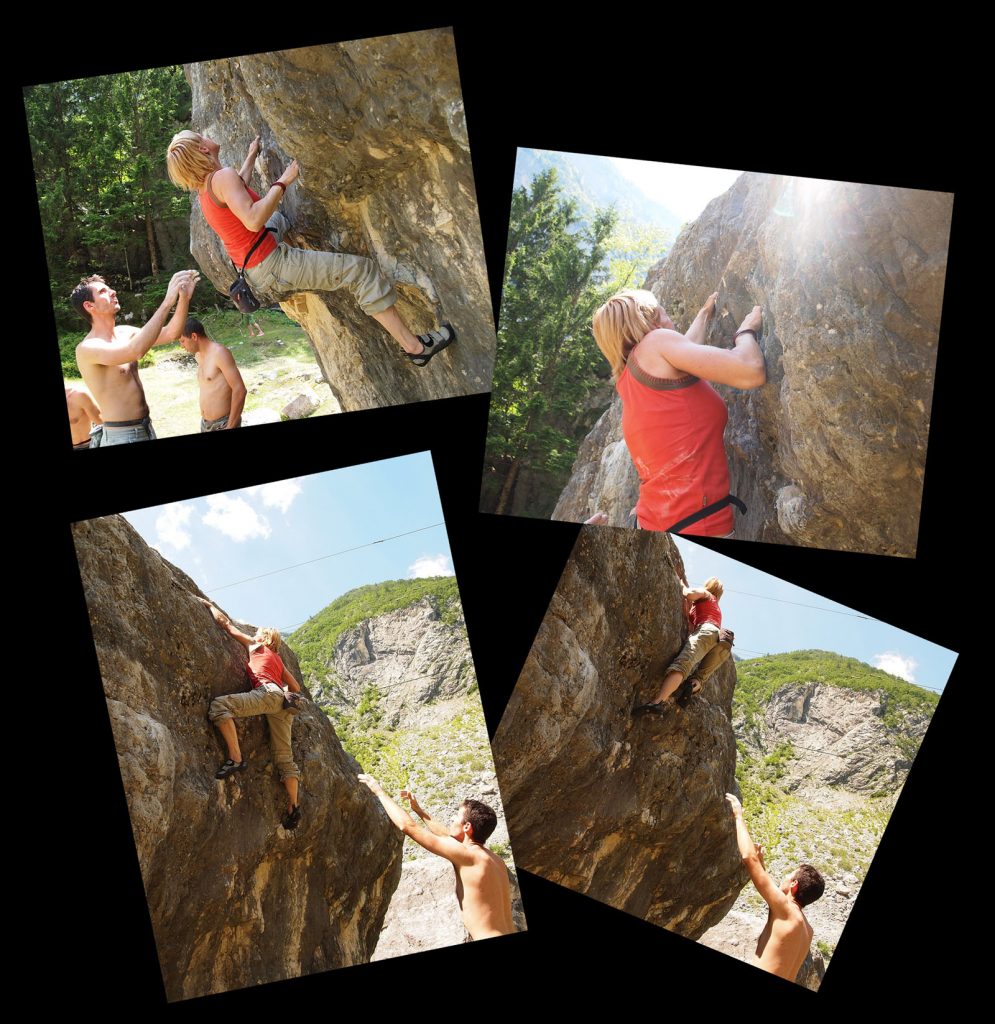 Tudi balvani so bili prav fini, sploh z odličnim inštruktorjem Grudijem. Baje nam je šlo kar dobro za prvič. Ko smo prišli pod skale sem kar z malo treme opazoval skupino mladeničev, ki so se ubadali s previsnimi detajli in se mi je zdelo, da tole mora biti pa res kar težko, če jim ne uspe splezati tistih treh metrov. No potem smo ob odličnih Grudijevih navodilih Damjan, Tanja in jaz v prvem poizkusu splezali kakšni dve smeri, s katerimi so se ubadali nadebudni mladci in ugotovili, da pa morda vsi balvanski problemi res niso tako težki. Za konec pa nam je Grudi še pokazal, kaj je to zaresno plezanje in je tako na hitro na pogled splezal še eno smer z oceno 7b, da smo se mi amaterji samo malo čudili.