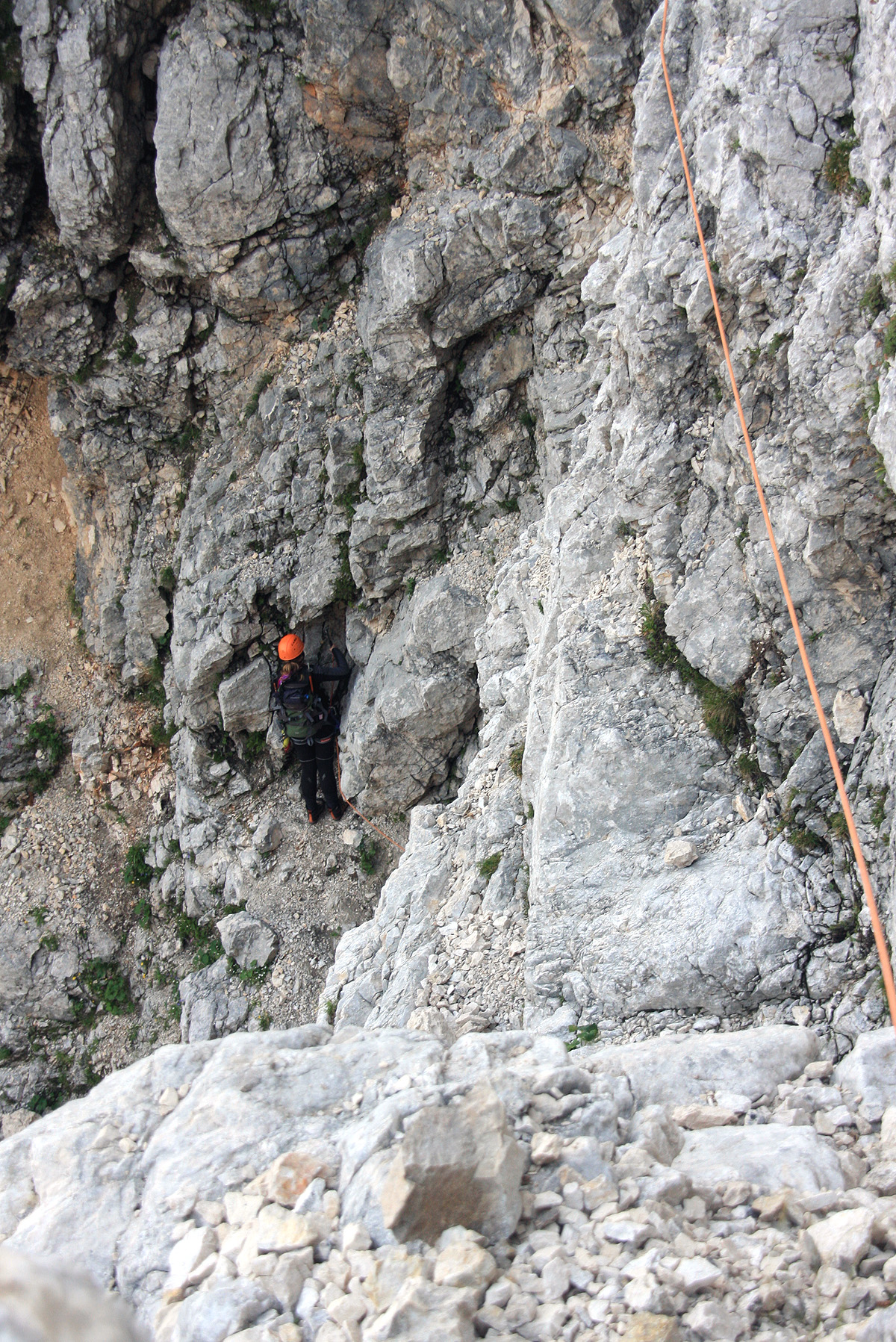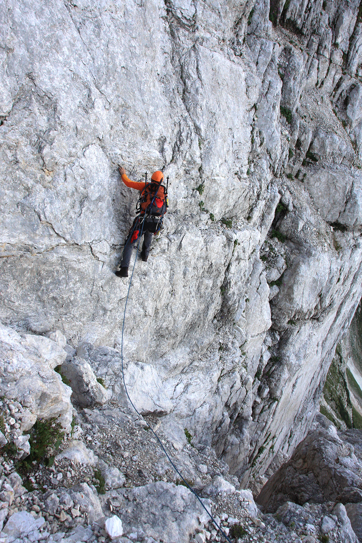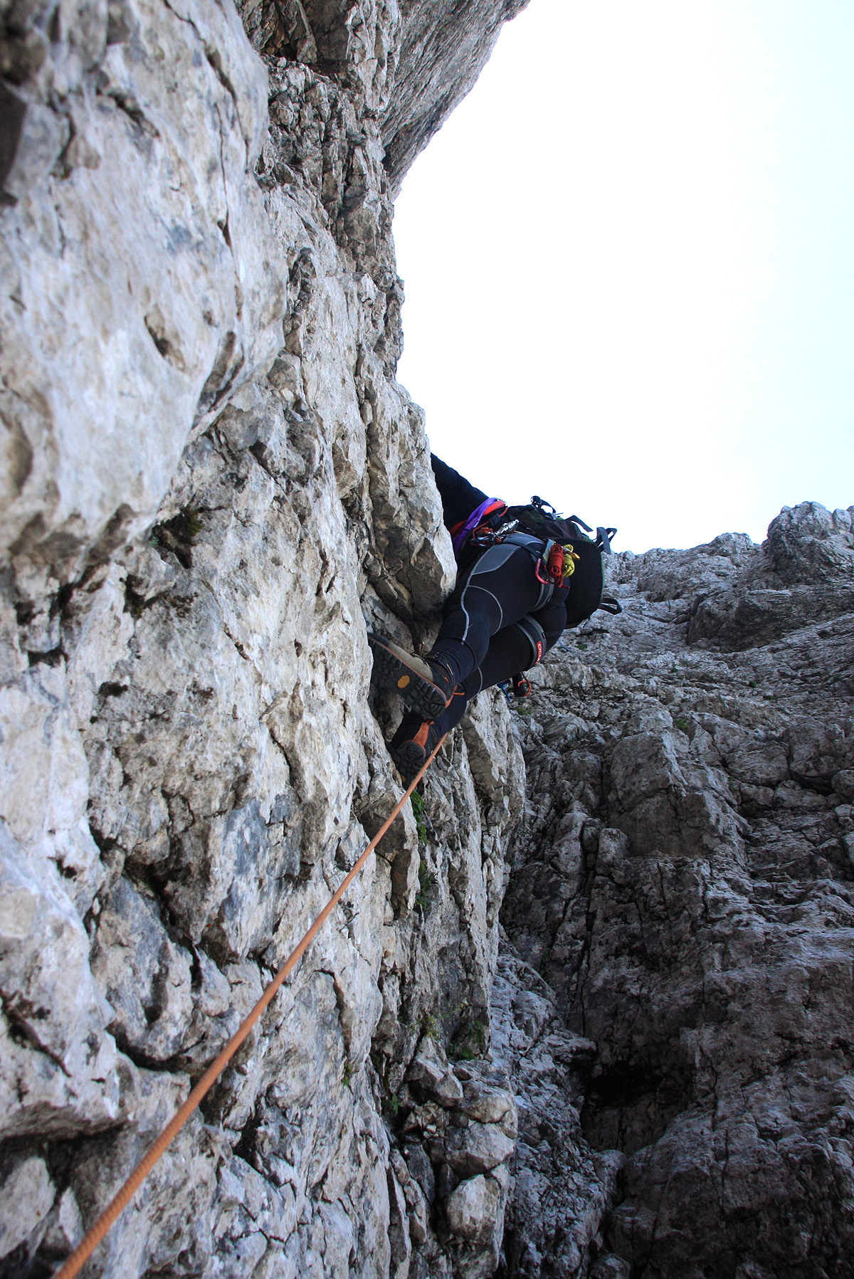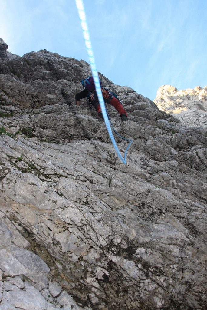 Naša smer je bila prijetna, a tudi naporna, predvsem zaradi dolžine in pogosto zelo krušljive skale. Kar nekajkrat mi je v roki ostal oprimek, za katerega sem bila prepričana, da bo dobro držal. Za priboljšek so nas bombardirali z vrha. Tik mimo nas je letelo kamenje, ki so ga prožili plezalci nad nami, včasih pa tudi naše vrvi. Na srečo smo jo vsi odnesli brez večjih poškodb. Sem pa zato imela nekaj smole z opremo. Na mestu kjer bi namesto pohodnih čevljev veliko raje imela plezalnike, se mi je vrv ovila okoli pohodne palice zataknjene za nahrbtnik. Na moj ukaz je Stane pobral vrv in nekaj sekund zatem je v ušesih odmeval zvok kovine, ko je izpuljena palica globoko pod nami udarjala ob skalo. Plezali smo v eni navezi in skoraj na vsakem sidrišču reševali in prepotegovali obe vrvi, zato smo napredovali dokaj počasi glede na nekaj navez, ki so nas prehitele in bile varovane kar po vodniško z navezo “štajerca”. Kasneje smo se tudi mi preuredili in nekaj manj nevarnih raztežajev napredovali na podoben način.