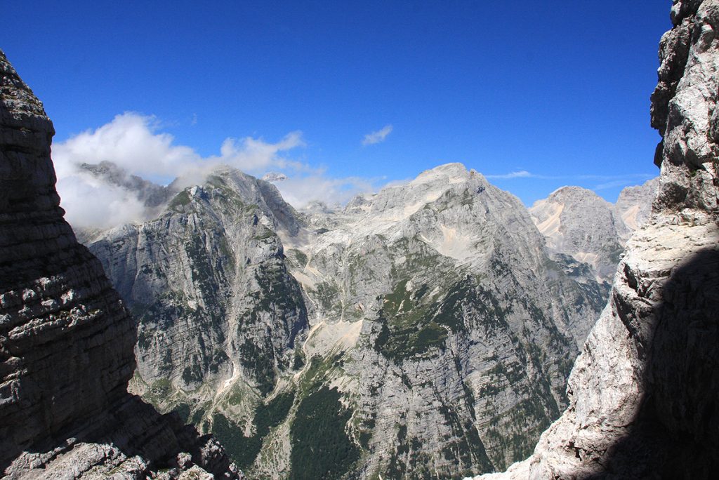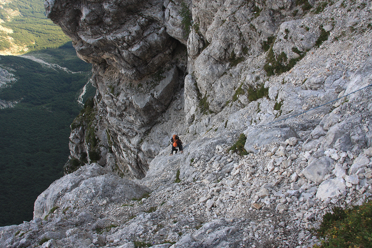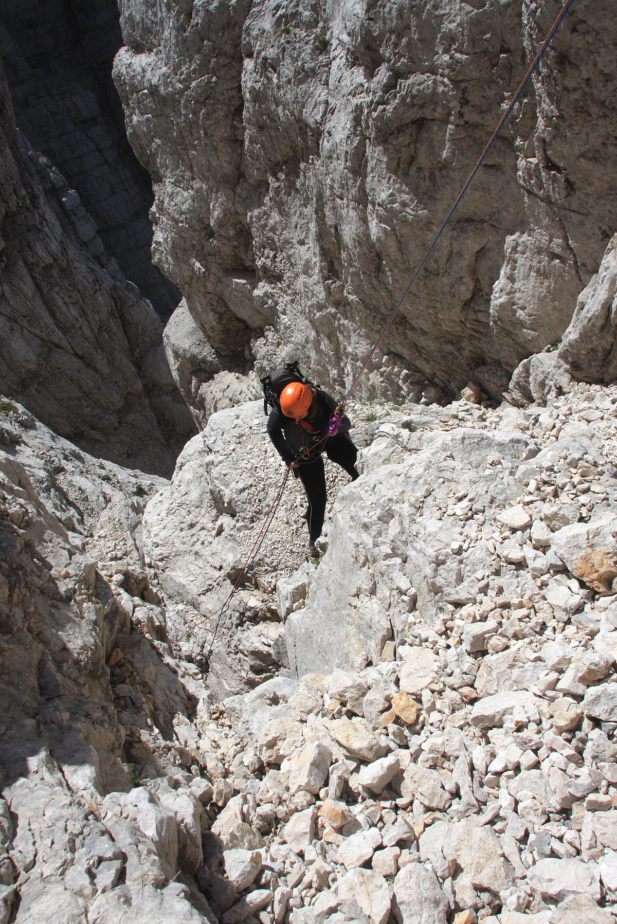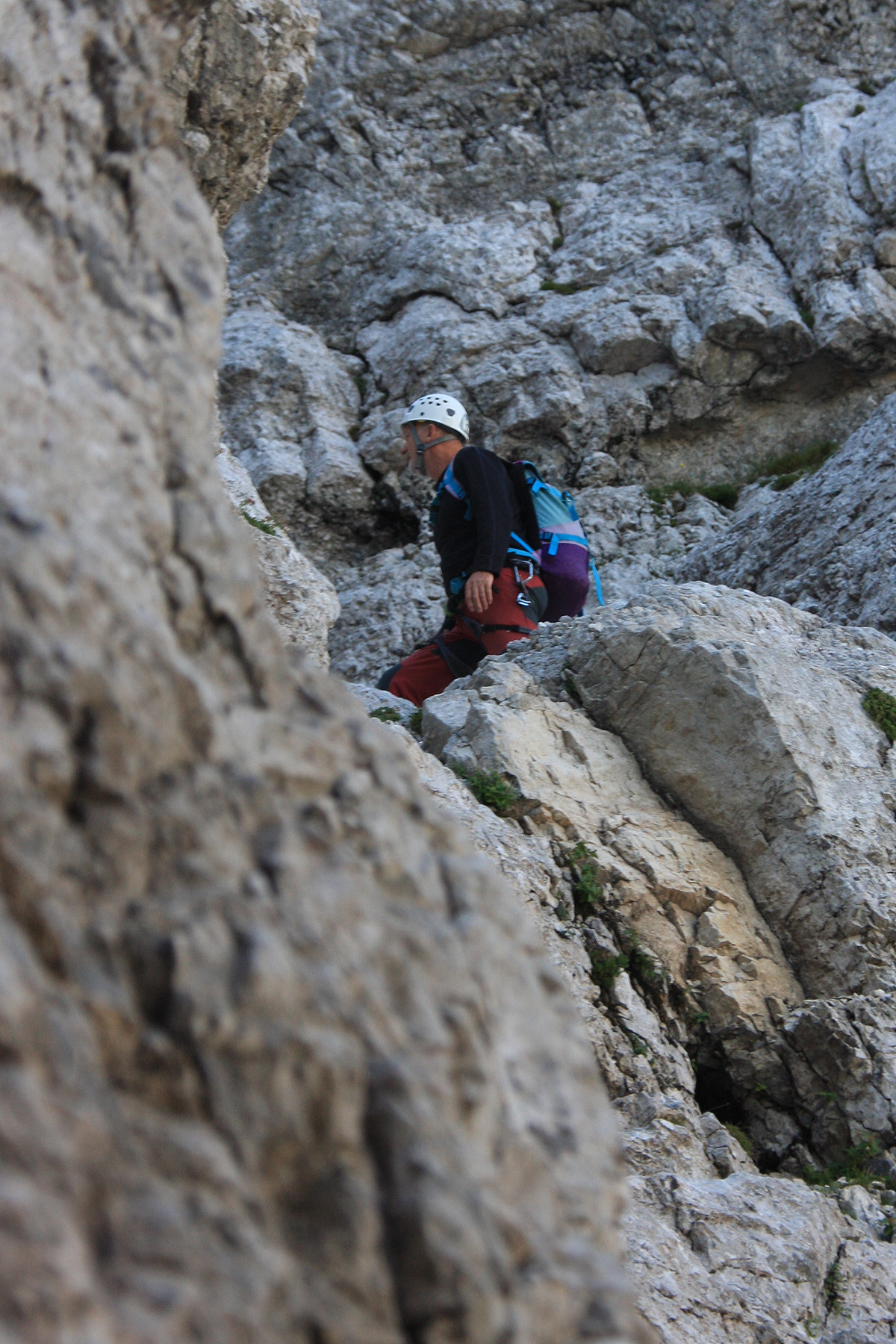 Naša smer je bila prijetna, a tudi naporna, predvsem zaradi dolžine in pogosto zelo krušljive skale. Kar nekajkrat mi je v roki ostal oprimek, za katerega sem bila prepričana, da bo dobro držal. Za priboljšek so nas bombardirali z vrha. Tik mimo nas je letelo kamenje, ki so ga prožili plezalci nad nami, včasih pa tudi naše vrvi. Na srečo smo jo vsi odnesli brez večjih poškodb. Sem pa zato imela nekaj smole z opremo. Na mestu kjer bi namesto pohodnih čevljev veliko raje imela plezalnike, se mi je vrv ovila okoli pohodne palice zataknjene za nahrbtnik. Na moj ukaz je Stane pobral vrv in nekaj sekund zatem je v ušesih odmeval zvok kovine, ko je izpuljena palica globoko pod nami udarjala ob skalo. Plezali smo v eni navezi in skoraj na vsakem sidrišču reševali in prepotegovali obe vrvi, zato smo napredovali dokaj počasi glede na nekaj navez, ki so nas prehitele in bile varovane kar po vodniško z navezo “štajerca”. Kasneje smo se tudi mi preuredili in nekaj manj nevarnih raztežajev napredovali na podoben način.