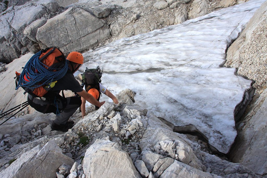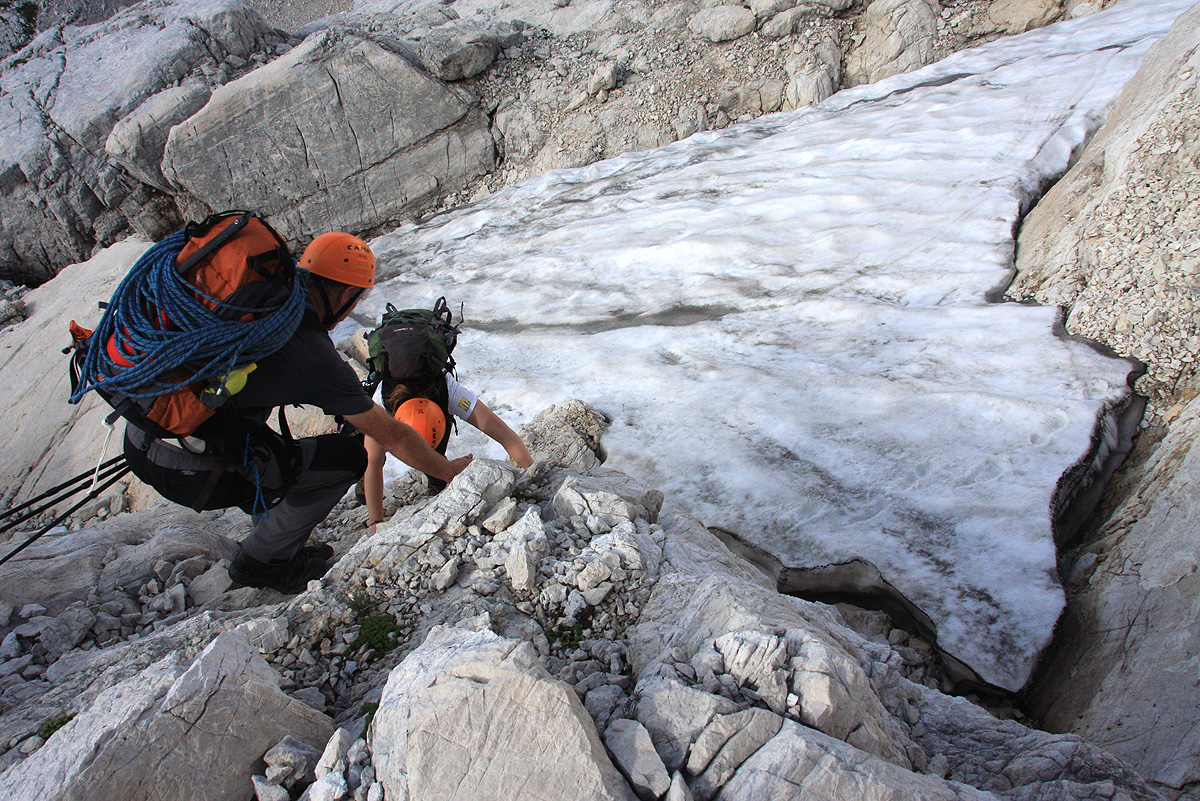 Vse skupaj se je zavleklo in smo iz Slovenske grape izstopili šele okoli dvanajste ure. Grapa je razen majhne zaplate snega na koncu, suha. Cepini so ta dan ostali neuporabljeni. Pred vstopom v Prevčev izstop sem se obrnila in si ogledala severno steno Triglava, kolikor sem je pač lahko videla. Že od daleč izgleda velika in zahtevna, a od blizu je naravnost mogočna in kar nisem mogla verjeti, da stojim sredi nje. V Prevčevem izstopu smo bili že vsi malce utrujeni, a smo napredovali hitreje kot v spodnjem delu smeri. Sicer smo najprej po nepotrebnem zlezli eno zajedo, obhod pa je bil spodaj, smo pa kar debelo uro časa porabili raztežaj naprej, ko smo zares zgrešili smer. Namesto po skoraj pohodni polici v desno, smo jo ubrali naravnost v strmo grapo, ki se je zaključila z gladko plato in dvema težkima kaminoma na straneh. Ker nekaj meterskega problema nismo uspeli zlezti, je bilo jasno, da tu čez ni prehoda. Zavedla sta nas dva na sredi plošče zabita klina. Takoj je bilo jasno, da ju bomo uporabili na enak način kot tisti, ki ju je zabil; za spust po vrvi nazaj v prvotno smer. Pavli ju je povezal, Mijo zvezal obe vrvi in že smo se spuščali po sesutem in naloženem svetu na rob, kjer je potrebno zaviti okoli stene.