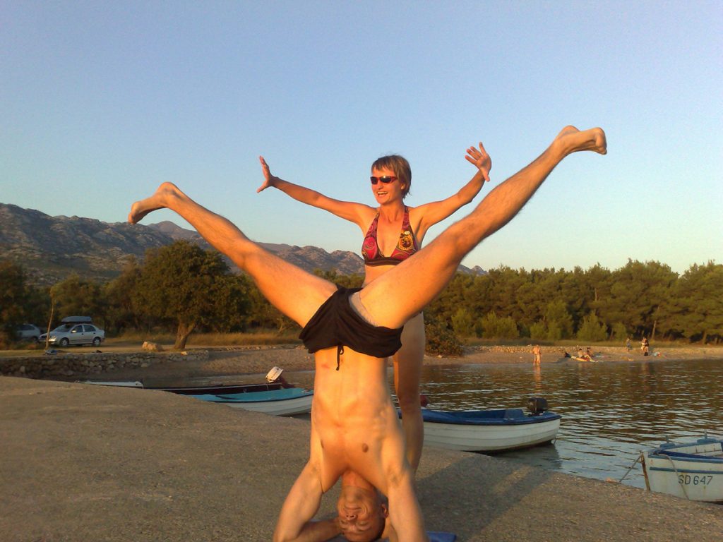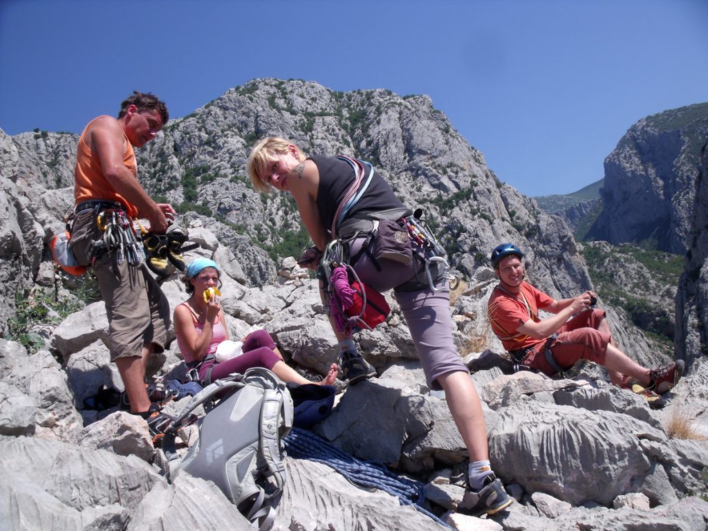 opazujemo potovanje sonca proti horizontu in Simonovo stojo na glavi, s katero si bistri misli. Večer prinese še gazdaričino rdeče vino in 7-glasno petje domačih in tujih klasik z improvizacijo na reggae podlagi “Mi plezamo”. In plan za naslednji dan. Dve štajerski navezi se odpravita v Šaleško, ki s svojo oceno mika tudi mene, vendar me 9-mesečna plezalna pavza zabremza in odločim se, da grem s Simonom frikat v kanjon. Z andohtjo. Tako ponovno odkrivam čar gibanja navzgor po kompaktnem plesišču, zaupanje se vrača. Odločitev se izkaže za pravilno, Šaleška presega svoj 4c. Mihelca z alpinistom iz domačega ferajna udari dol (oziroma gor) še Celjski stup. Na večer si privoščimo brancine kod Dinka, bil bi greh, če se ne bi nagradili z najboljšim žarom na Jadranu. Da ne bi bilo preveč kičasto, nas na hitro nažgejo žlahtne krvi lačni komarji, zato jim pobegnemo v Starigrad. Na štante! Najprej poslušamo šumenje v školjkah, potem pa še jazz-rokenrol zasedbo, ki preglasi sosednjo štancarijo tretje klase. Mihelca nam po poštenem plezalnem dnevu zadremucka sredi tega glasbenega miksa, zato se že skoraj odpravimo z oslovsko kočijo nazaj k Vesni, ampak to bi blo pa že res preveč kičasto. Tokrat ležemo k počitku malo prej.