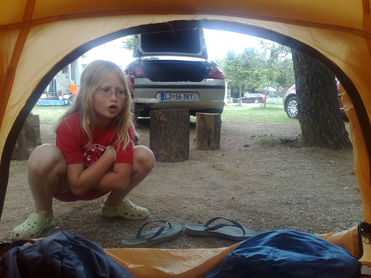 preverjat stanje v ostalih dveh kampih. Marko zabasan, Aniča Kuk na čistem soncu. Ko se vračam proti Vesni, ugledam njihove sijoče obraze, razžarjene od zadovoljstva po preplezanih smereh, Nosorog in Fleks&Reks. Seveda smo s hladnim pivom poplaknile uspešno otvoritev tokratne plezarije in naše ponovno snidenje. Z Mihelco sva si takoj všeč, po par stavkih ugotoviva, da nama bo gladko steklo cimrovanje v mojem oranžnem iglujčku. Seveda se je kmalu izkazalo, da nama skupno plezanje tudi teče gladko, kako pak drugače. In gladko steče tudi ostalo, izpod Vesninih borovcev se domov odpravi družina iz Kranja in že imamo celo rezidenco, vključno z aromoterapijo, mizico in štoreki za stolčke. Pa tudi družbo fantov, Aleša iz Mihelčinega ferajna s kameradom in Simona s kitaro, poleg ostalih. Po slastni domači pašti se vržemo v vodo,