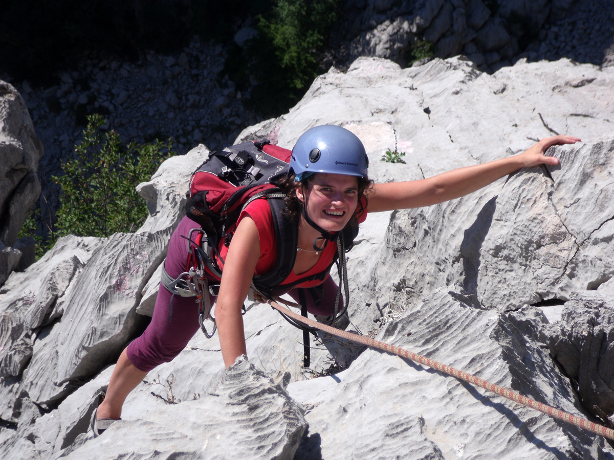 Naslednji dan pa le dočakam svojo dolgo po dolgem času. Po jutranjem kremženju neba se izčisti prečudovit vroč dan. Severno rebro čaka. Po dostopu nam kaplja iz trepalnic. Mihelca jo napelje za Benom, alpinistom iz njenega ferajna. Na štantu opazujem ples senc ptic, ki preletavajo, se smehljam v prostrane stene in energija kanjona me polni z mirnostjo. Mimo prifrfota metulj. Polno lepote. Kakšna svoboda! Hvala ti, kraljestvo Paklenice.