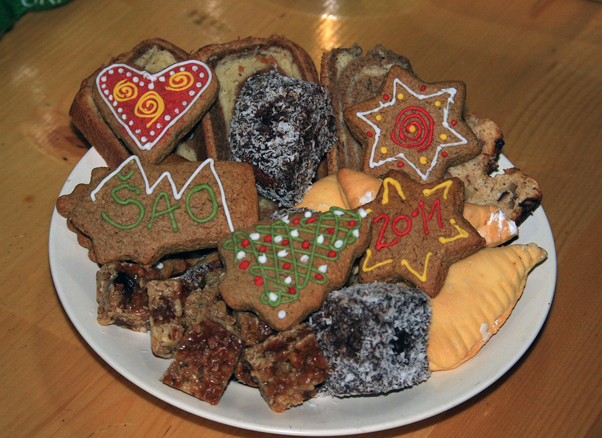 Vmes, pred in po uradnem delu seveda ni manjkalo pravega testa za večerjo. Po mineštri smo zmazali aviacijo. Sledil je, kakor se za vsako lovsko kočo spodobi, divjačinski golaž. Vse izpod Sergejeve kuhalnice. Da smo imeli ves čas sladke prste, sta poskrbeli Anja in Marija in še kdo. Medenjaki so bili tako lepi, da jih je bilo skoraj škoda pojesti. Tudi tekočih zalog je bilo dovolj.